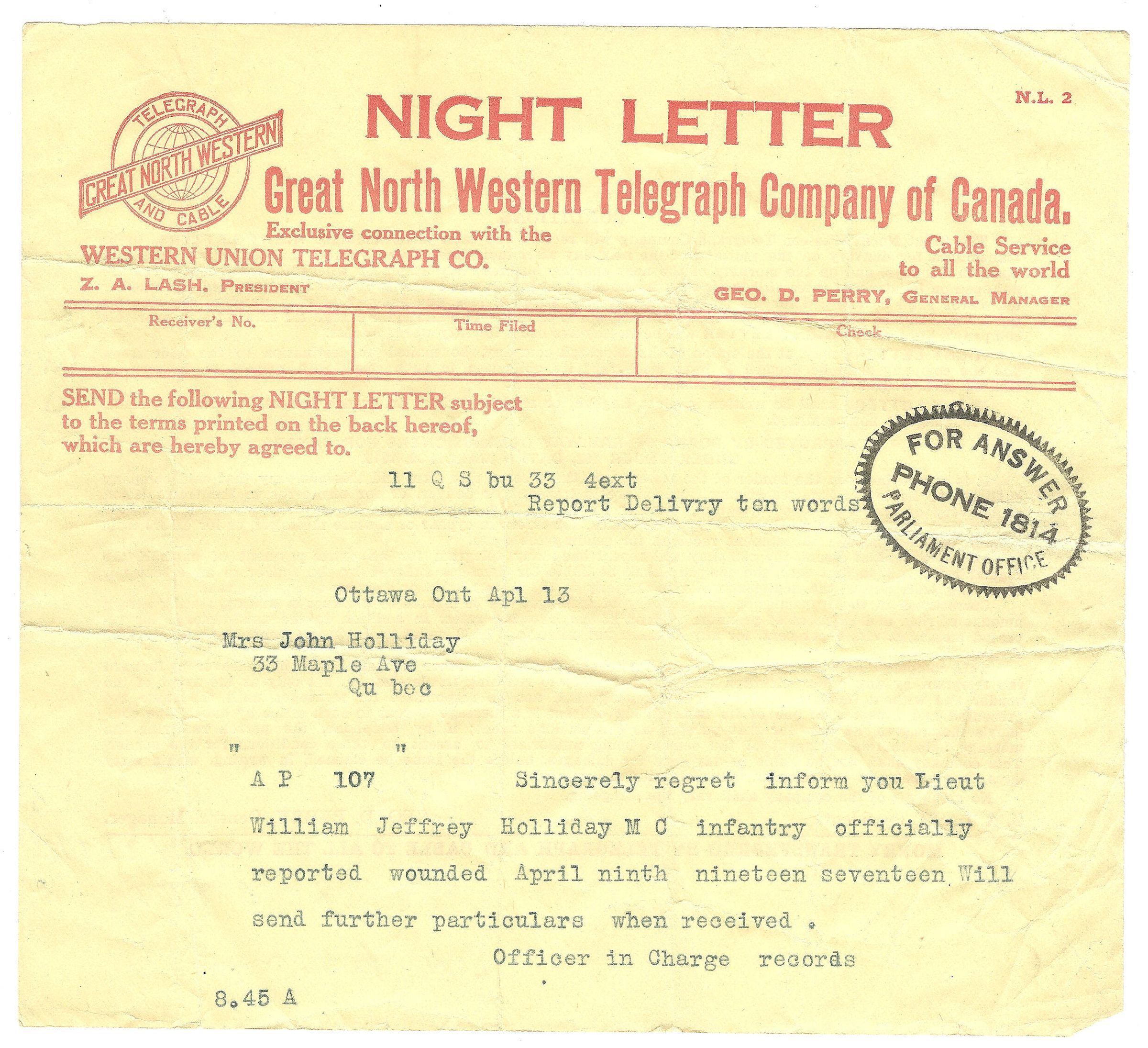 A telegram form with a typed message dated Ottawa, April 13, 1917, advising Mrs. John Holliday that her son Lieutenant William Jeffrey Holliday had been reported wounded.Archive Details