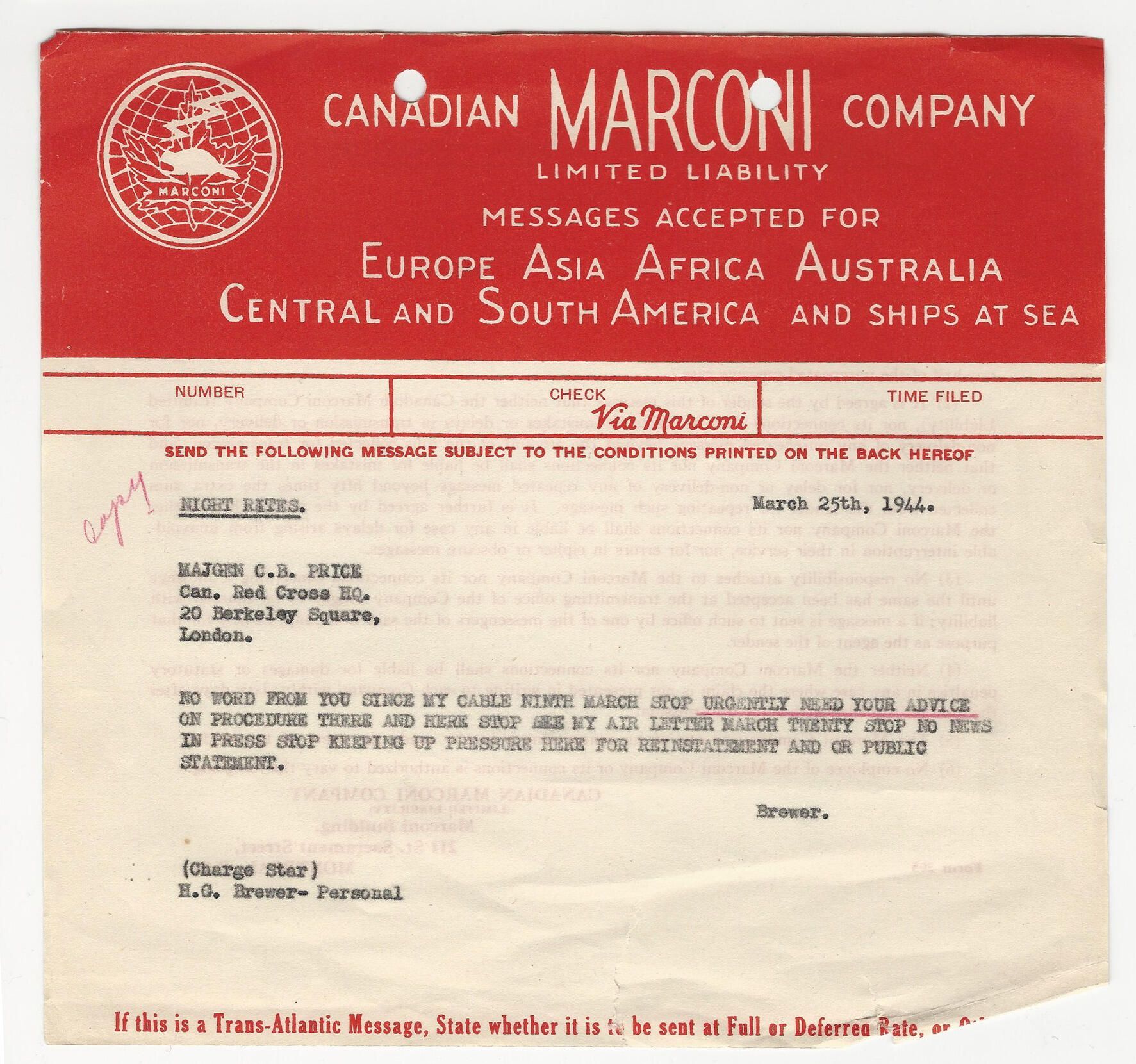 A copy of a telegram sent by Lieutenant Colonel Hugh G. Brewer, Commanding the 2nd Bn., The Royal Montreal Regiment, to Maj.-Gen. C. Basil Price at Canadian Red Cross Headquarters, London, inquiring about the status of the recently disbanded 32nd Cdn. Recce. Regt. (Royal Montreal Regiment) and expressing the need for pressure to have the Regiment reinstated.Lexicon
