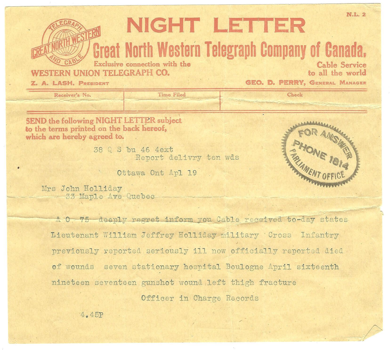 A telegram form with a typed message dated Ottawa, April 19, 1917, advising Mrs. John Holliday of the death due to wounds of her son Lieut. William Jeffrey Holliday in a military hospital in Boulogne, FranceArchive Details