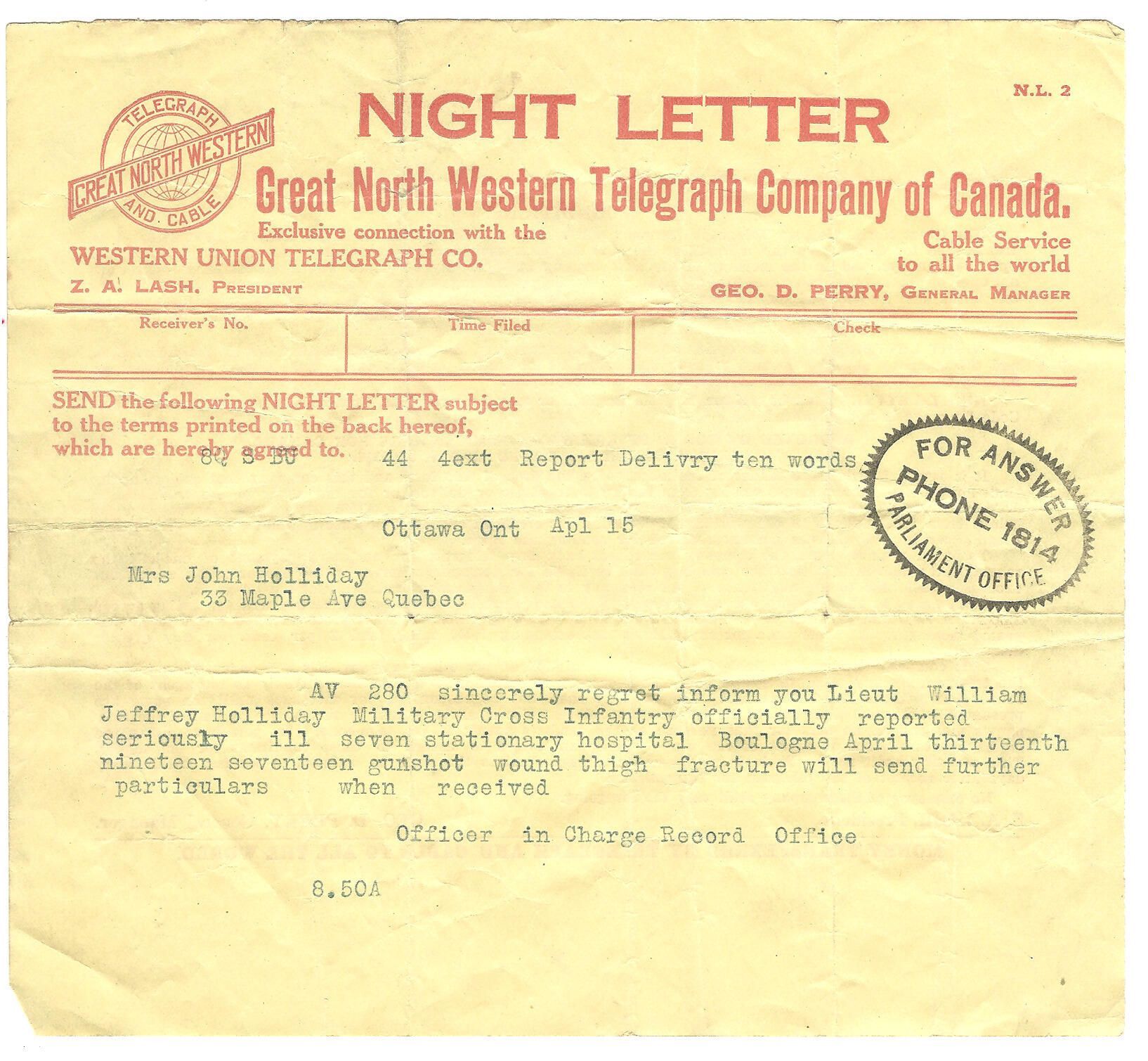 A telegram form with a typed message dated Ottawa, April 15, 1917, advising Mrs. John Holliday that her son Lieut. William Jeffrey Holliday was now seriously ill in the military hospital located in Boulogne, France, due to wounds.Archive Details