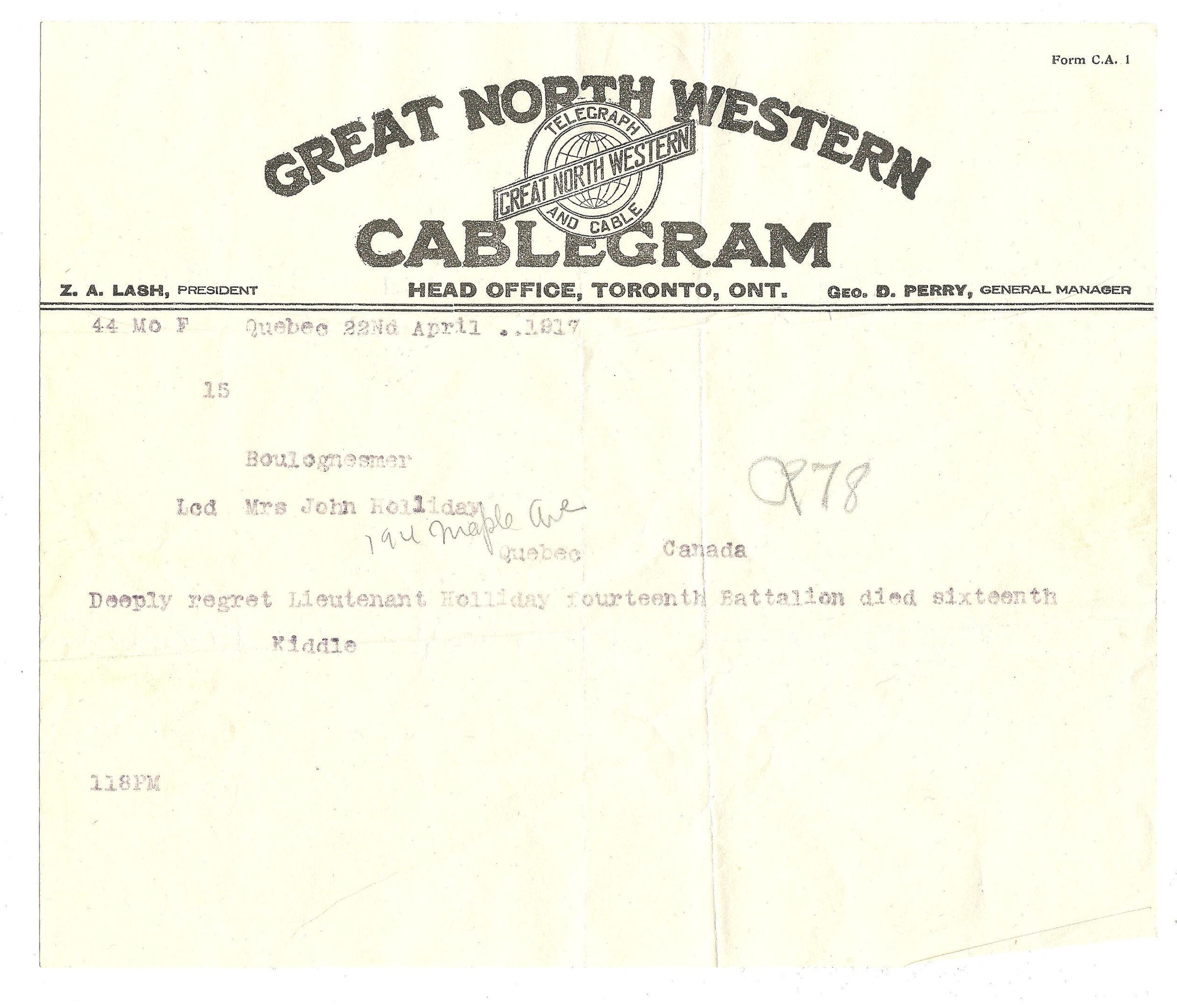 A short telegram dated April 22, 1917, to Mrs. John Holliday informing her of the death of her son, Major William Jeffrey Holliday, from a sender using the name "Kiddle."Archive Details