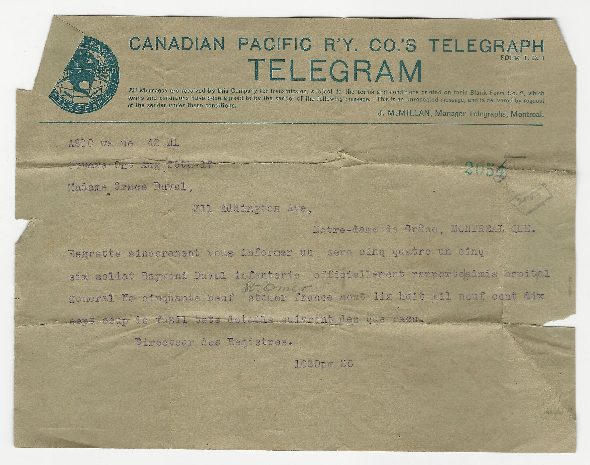 A C.P.R. Railway Co. Telegram in the French language from the Directorate of Records advising Mrs Grace Duval that her husband Pte Raymond Duval had been hospitalized at St. Omer, France, with a gunshot wound, with details to follow.Archive Details