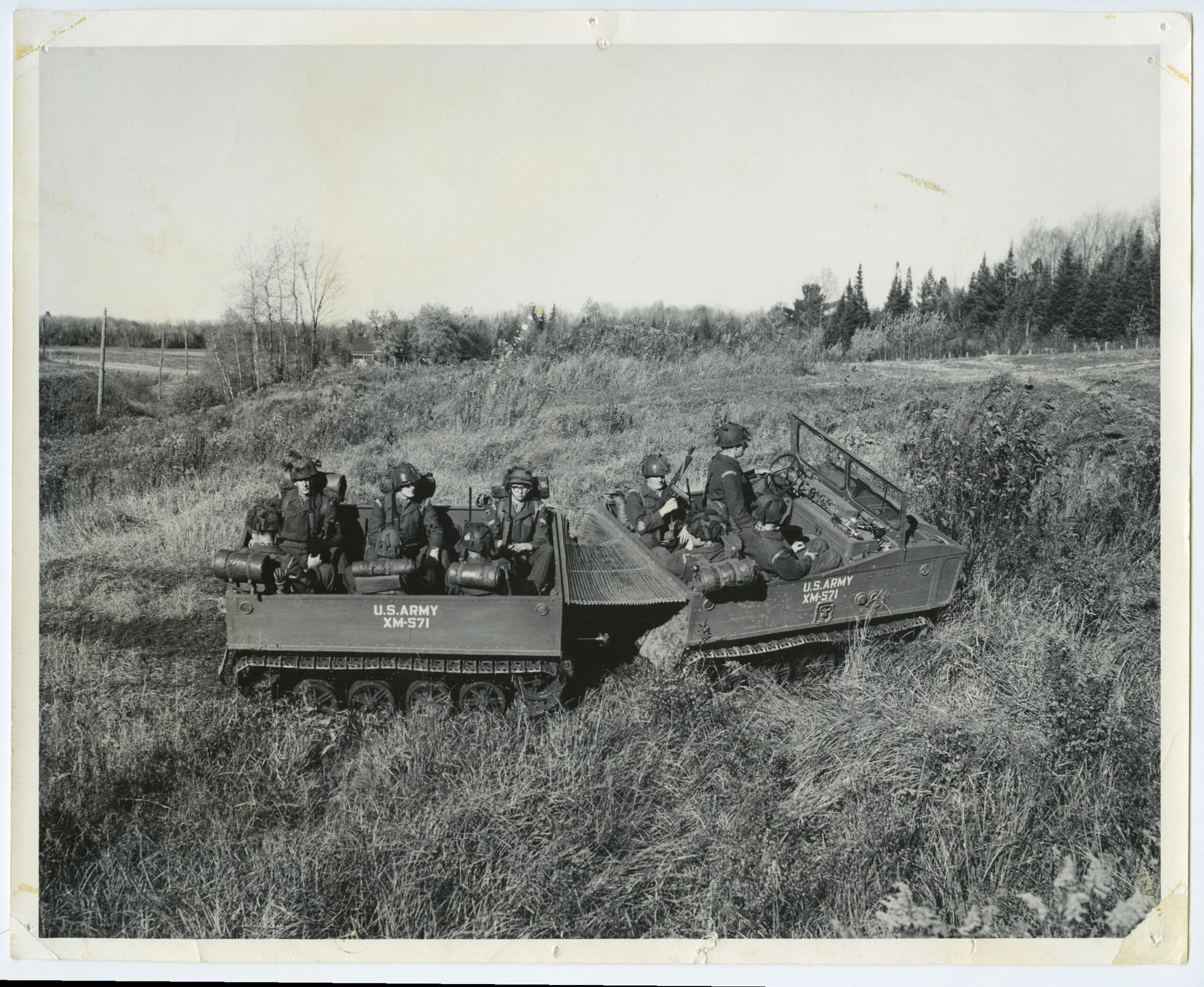 A group of Royal Montreal Regiment soldiers are testing an experimental vehicle at Camp Farnham. The soldiers are in battledress, 51 Pattern Webbing and equipped with FNC1 Rifles and Thompson Sub Machine Gun.Photograph Details