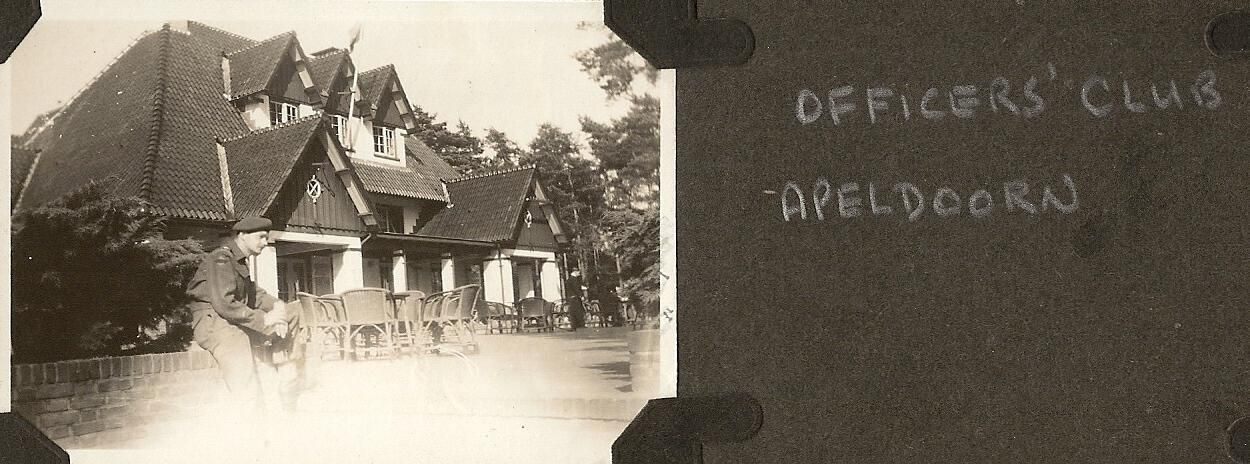 A black and white photo of Lieutenant Thomas Scovil wearing his battledress uniform and khaki beret. He is seated on a brick wall outside the Officers' Club in Apeldoorn, Holland.Photograph Details