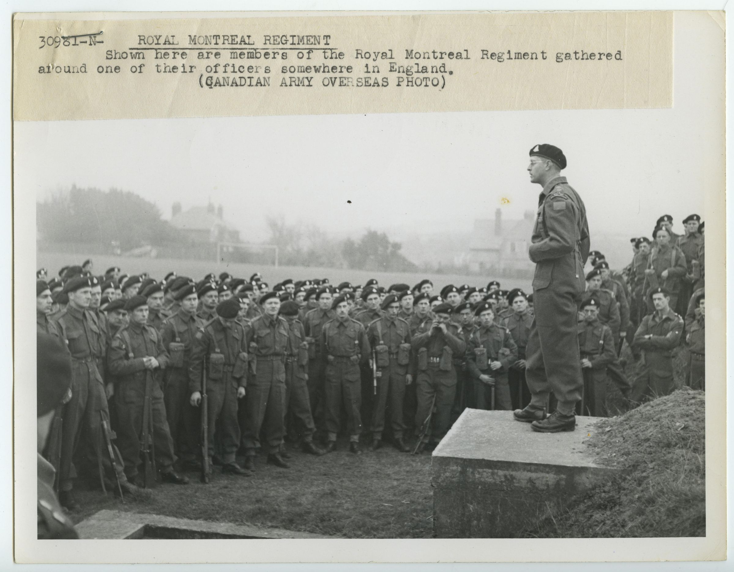 A black and white photo of the members of the 32nd Reconnaissance Regiment (RMR) gathered around their Commanding Officer, Lieutenant Colonel T.C. Lewis. They have been told that the Regiment would be reduced to NIL strength, in the lead up to Operation Overlord, the Invasion of Europe.