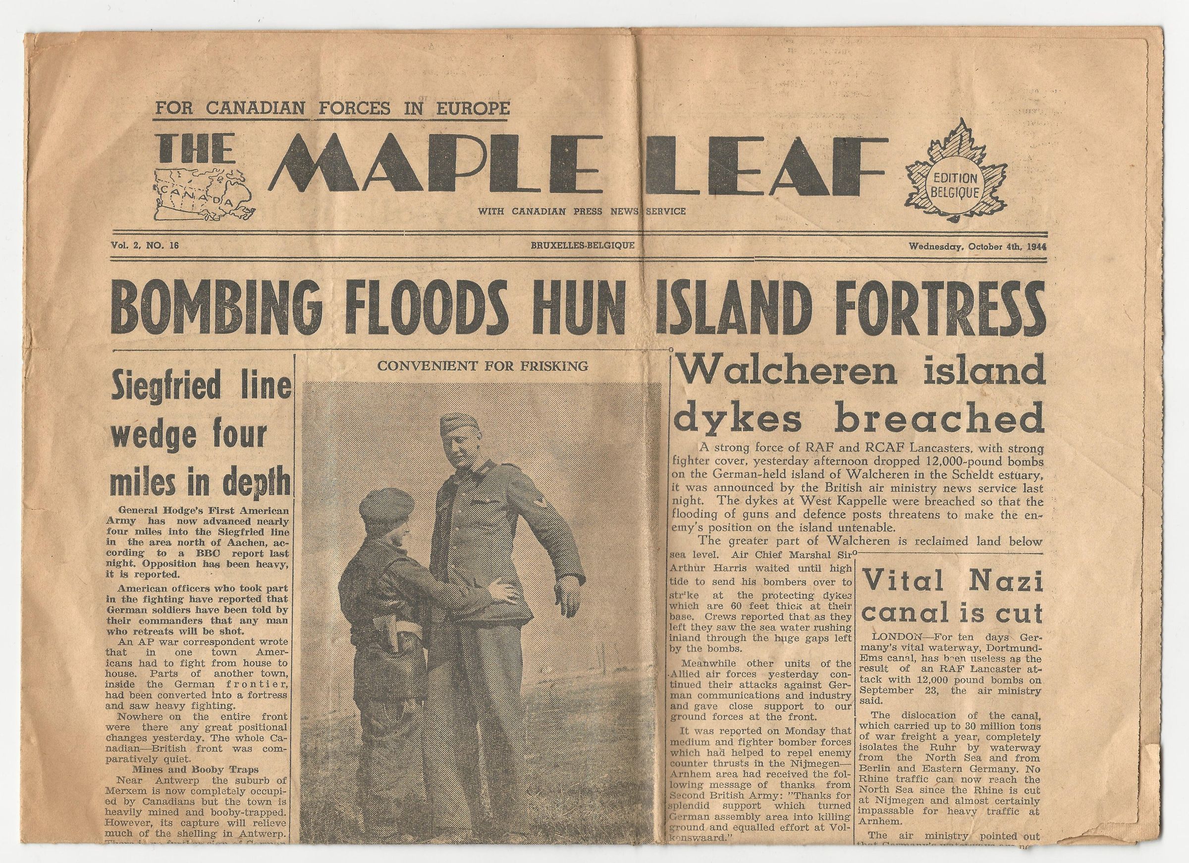 A copy of the Maple Leaf Newspaper published by the Canadian Army for Canadian soldiers in Europe. The paper discusses the breaching of Dutch Dykes, the cutting of vital German lines of communication and the penetration of the German Siegfried Line. In the photograph Corporal Bob Roberts, 5' 6" tall, is patting down German Corporal Jakob Nacken, 7' 8" tall. Before the war, Jakob Nacken was a circus personality who attended the 1939 New York World's Fair.Publication Details