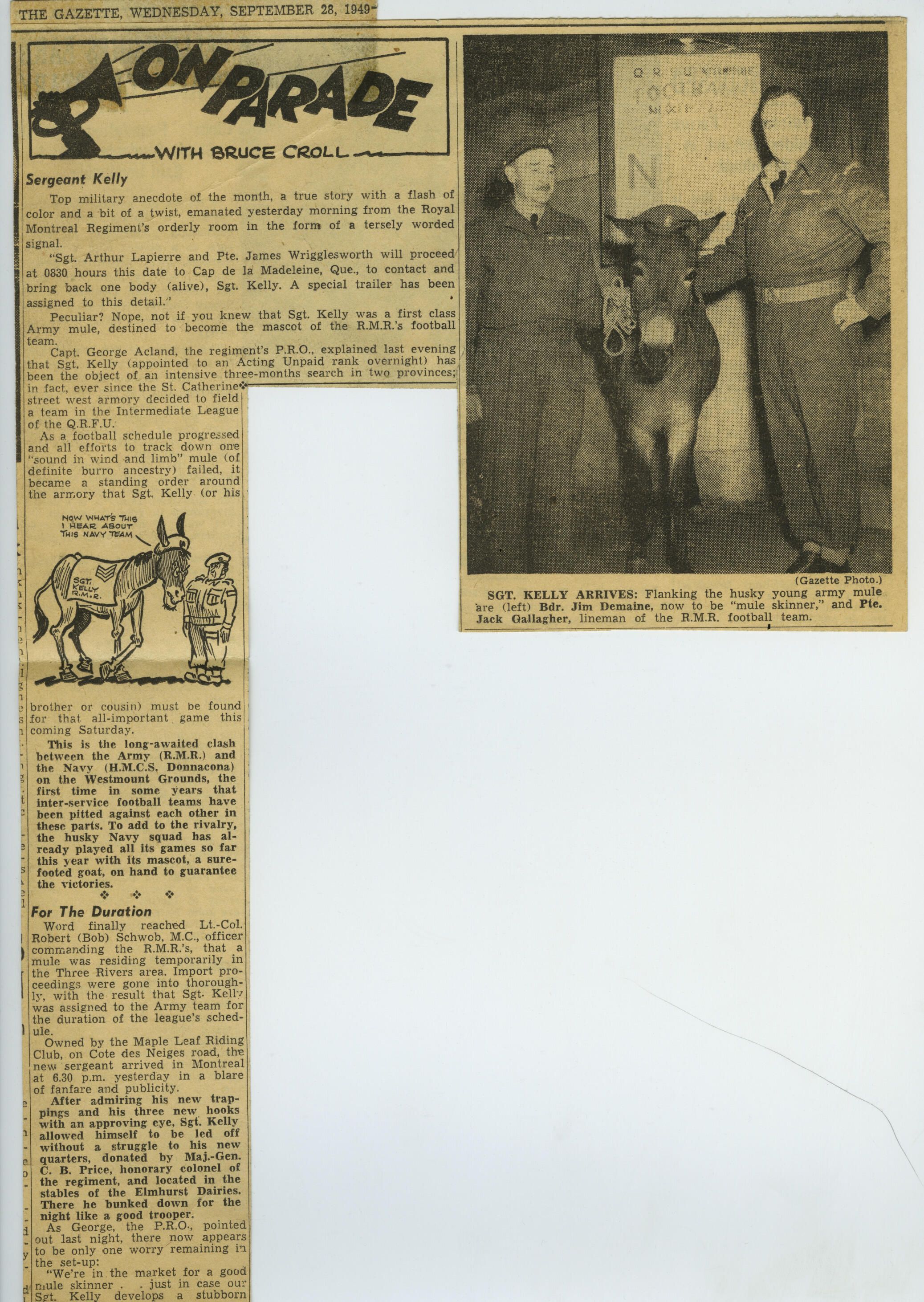 A newspaper clipping with photo about "Sgt Kelly", the mule mascot of The Royal Montreal Regiment Football team.Lexicon