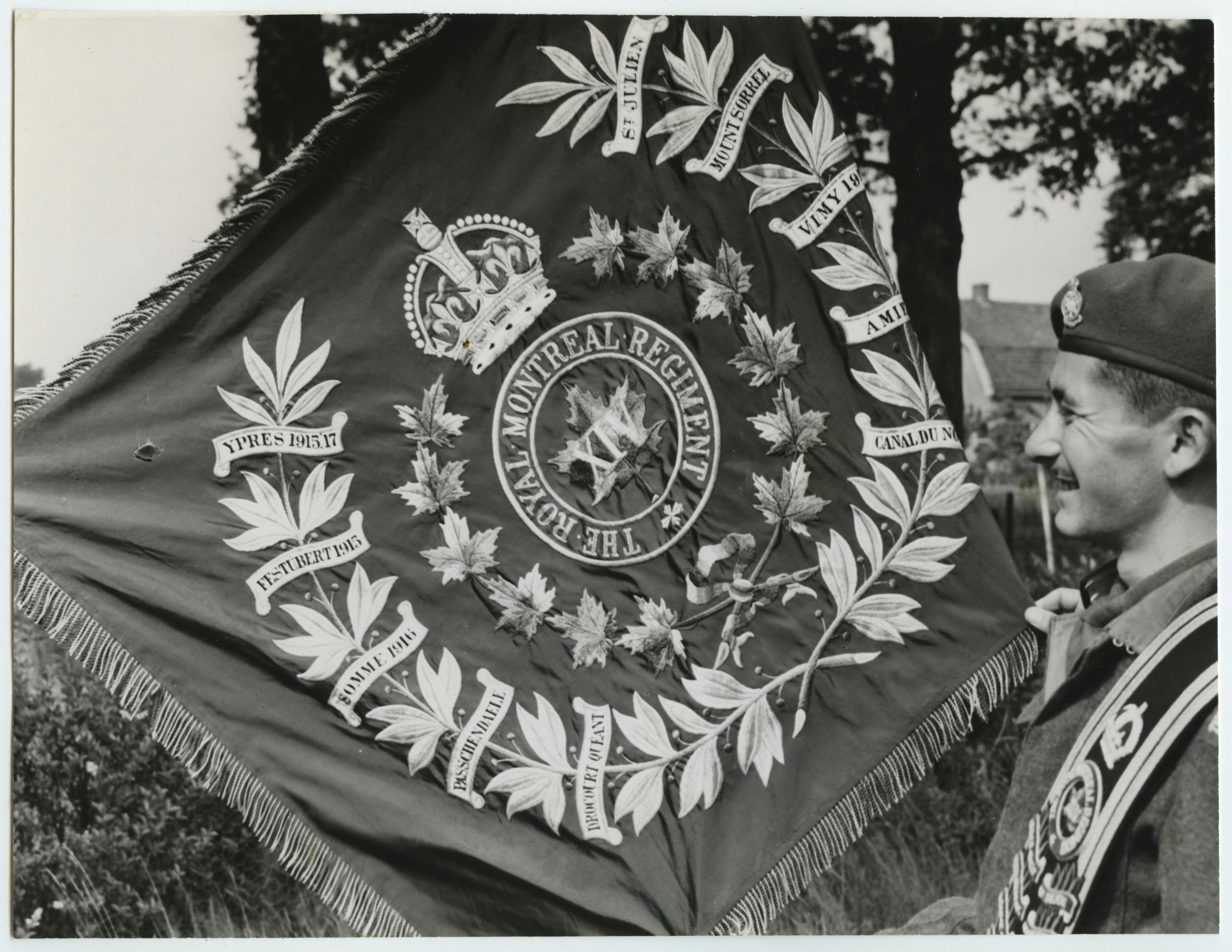 Lieutenant Leo Sedlezky is holding The Royal Montreal Regiment’s newly acquired Regimental Colour. He is looking at the First War Battle Honours on the Colours and smiling.Photograph Details