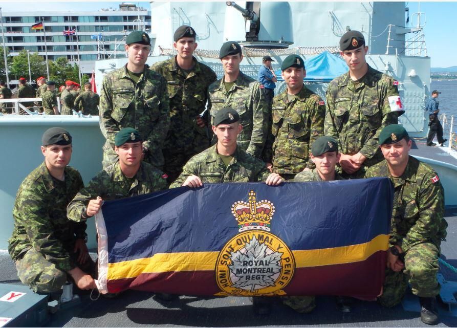 Nine members of the RMR Contingent, to the Nijmegan team, gathered for a group portrait with The Royal Montreal Regiment's camp flag after reaching their destination. The group marched from CFB Valcartier to the Port of Quebec in celebration of the 100th Anniversary of Camp Valcartier’s inauguration.