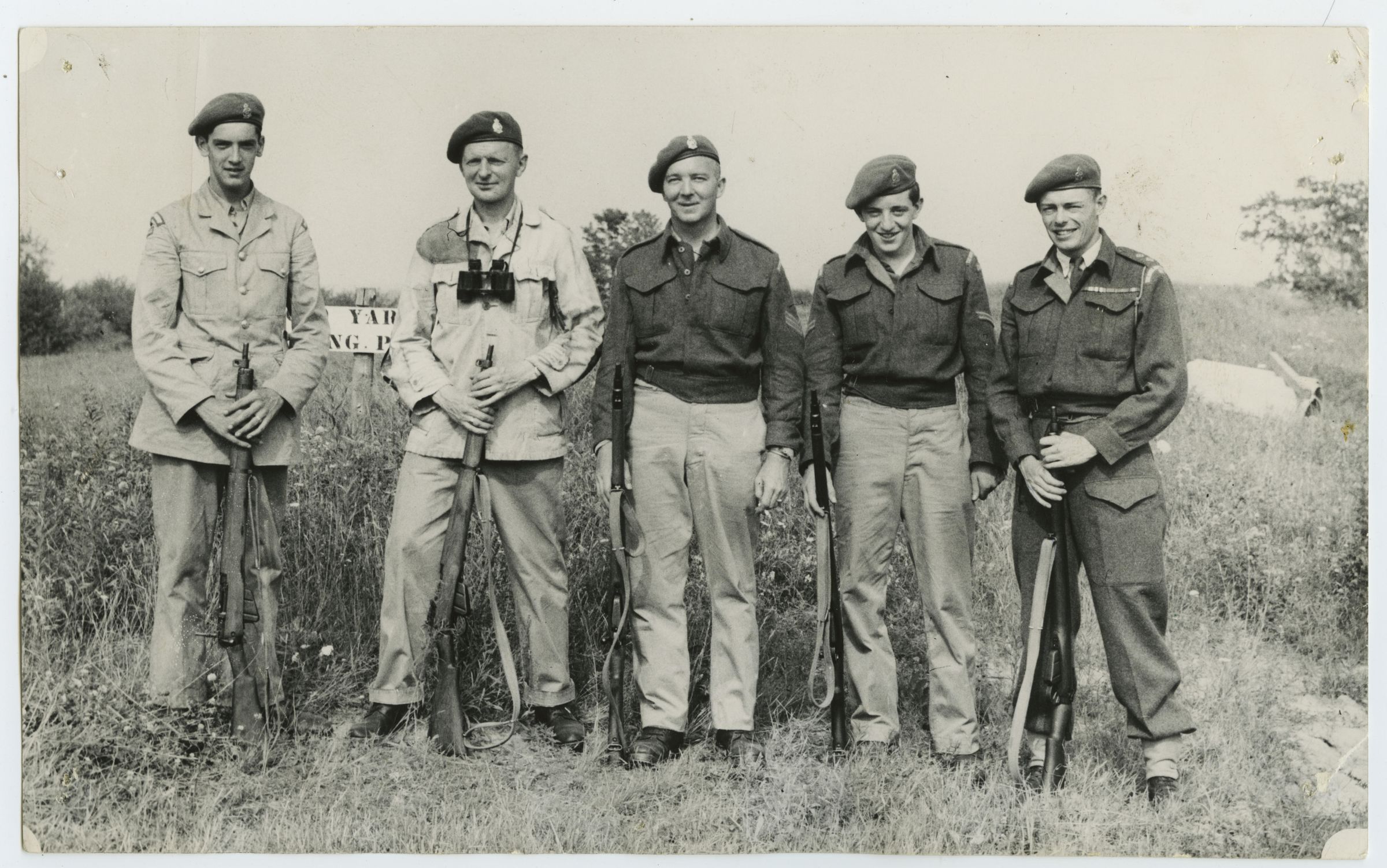 Five members of the Regimental Rifle Team in uniform are posing on the rifle ranges. The RMR has always been known for its competitive shooting skills. Here Captain Gilles G. Perodeau, Sergeant Major Herb Bent and their driver Pte Shaughnessy after shooting on the St-Bruno Ranges. In October 1950 the team led by Major Donald MacRae won the Kings Medal Match Championship against the Royal Rifles of Canada, of Quebec City.Photograph Details