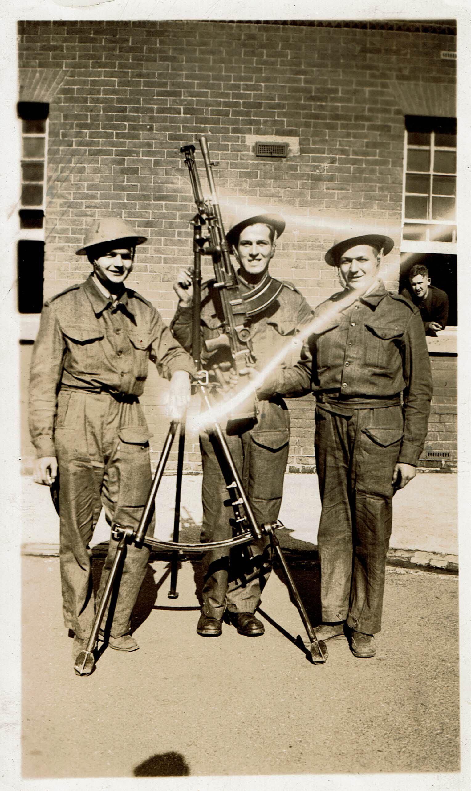 A black and white photo of Southmayde S. Scovil and Thomas K. Scovil with their friend Francis C.L. Wyght. They are standing outside barracks in British battledress uniforms. Francis C.L. Wyght, in the centre, is holding a Bren light machine gun fitted on an Anti Aircraft mount.Photograph Details