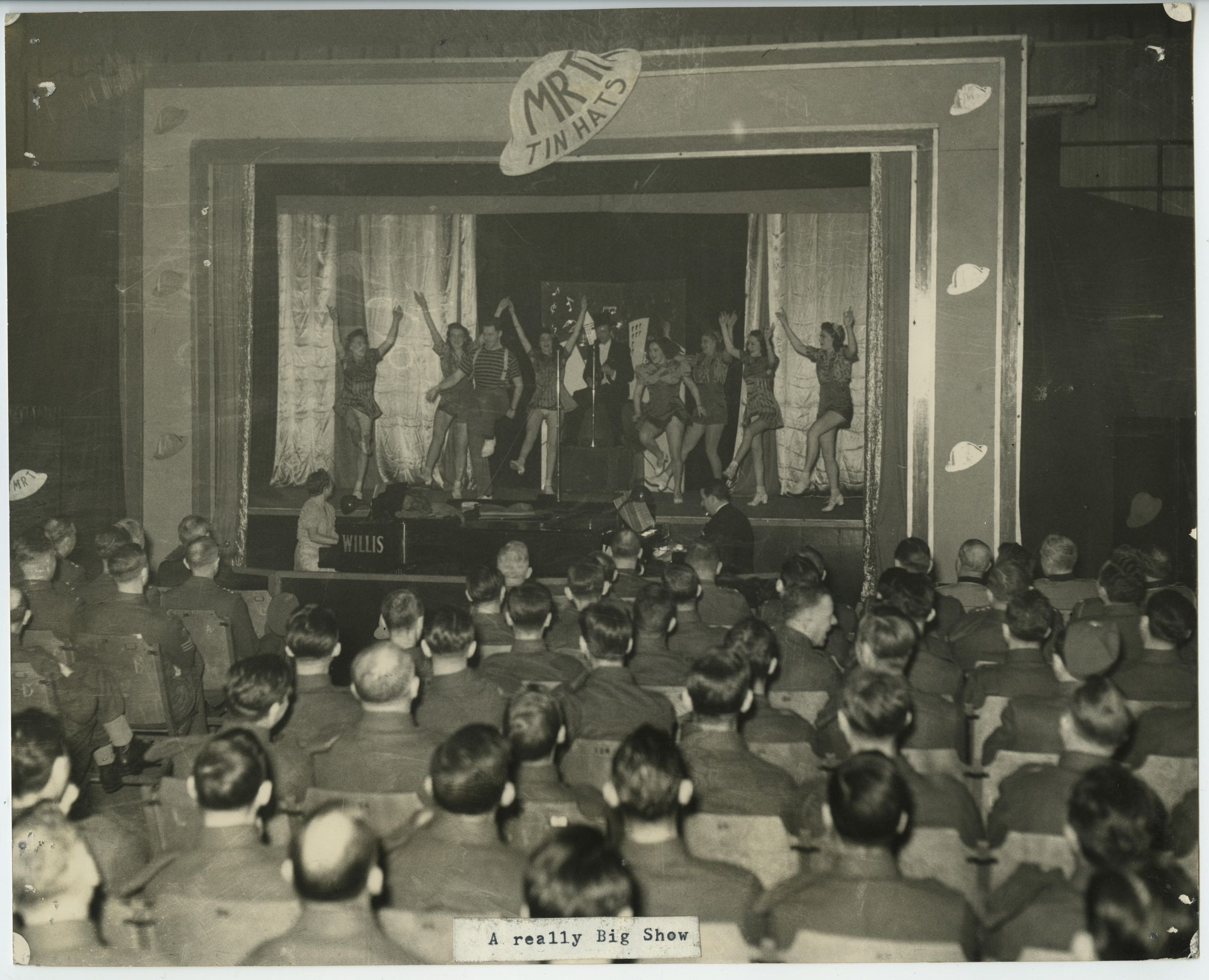 A black and white photo of a variety show titled "Tin Hats" put on by the Montreal Repertory Theatre for the members of the 2nd Battalion RMR, within the premises of the Westmount Armoury.Photograph Details