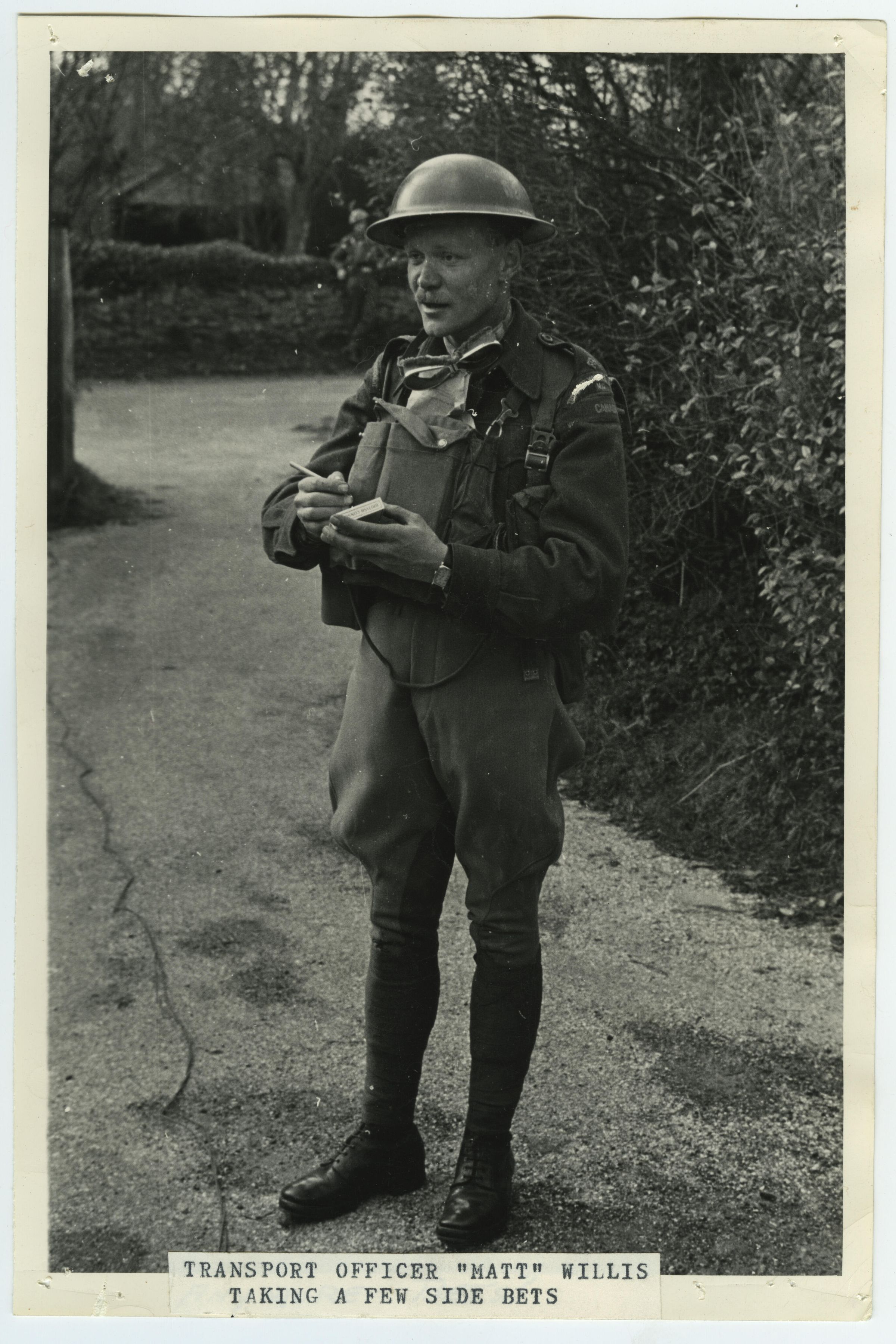 A black and white photo of Lieutenant Matthew A. Willis in his role as Transport Officer. He is wearing dispatch rider riding breeches and boots. He is also wearing the usual "Brodie" steel helmet, personal webbing, cased respirator, and dispatch Rider goggles.Photograph Details