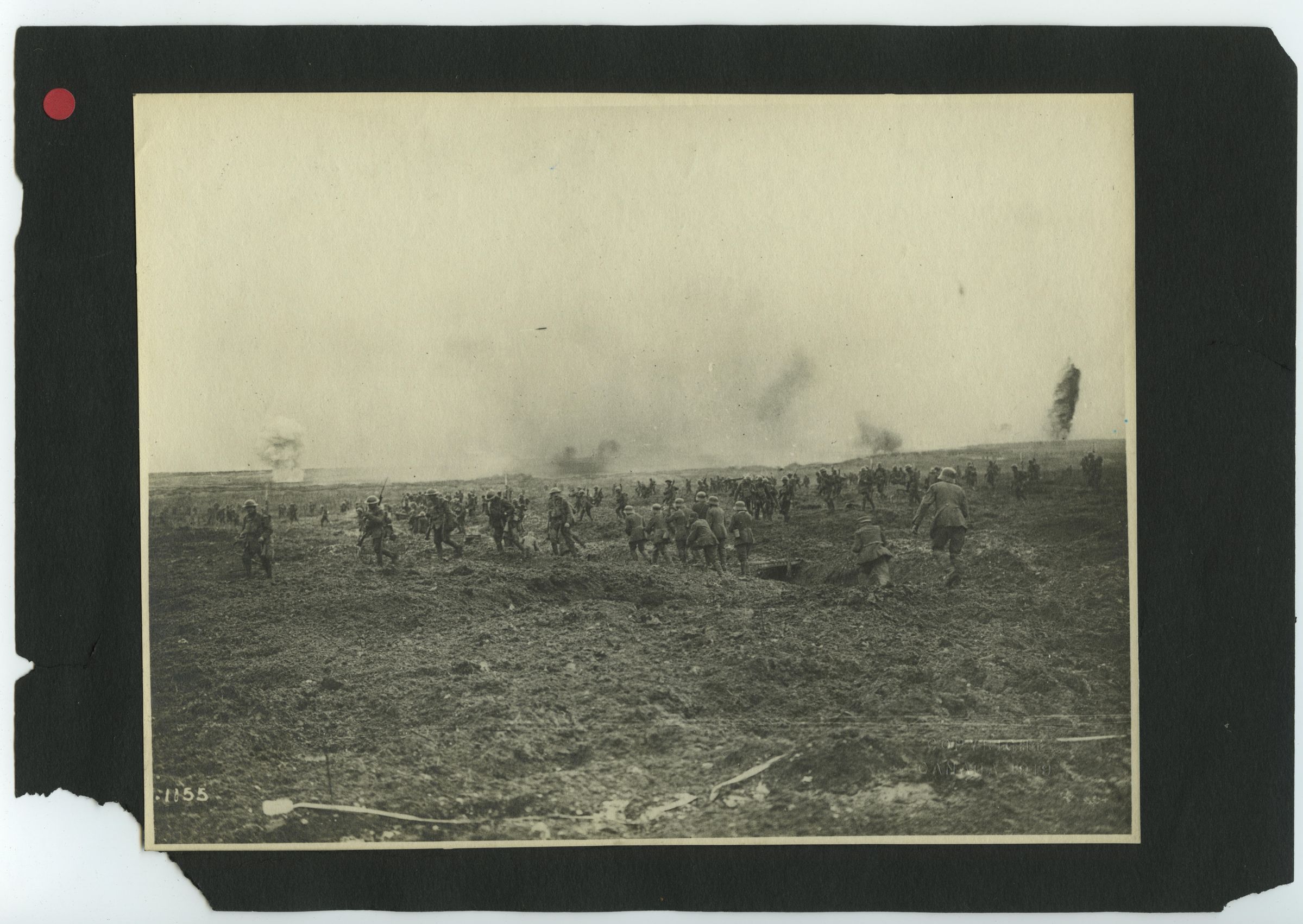 Canadians advance at Vimy Ridge, April 1917. A large number of armed and helmeted soldiers are advancing into the distance behind exploding artillery shells and smoke ahead of them.Photograph Details