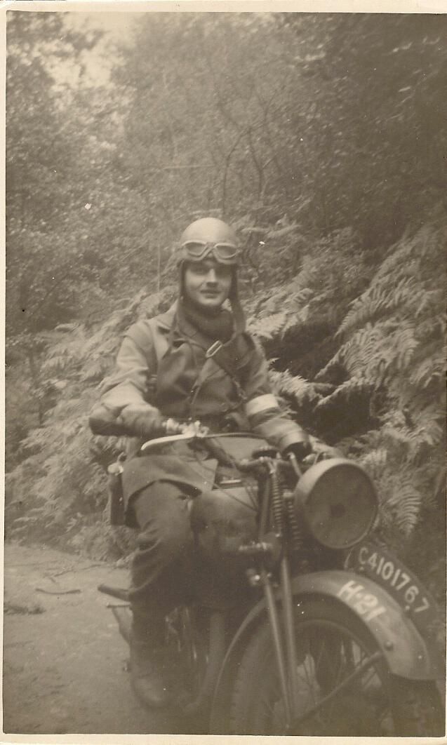 A black and white photo of Private Thomas K. Scovil astride his Norton WD 16H motorcycle near Pound Hill in West Sussex, England. He is dressed in full despatch rider regalia with the gauntlets, the boots, a jerkin, a helmet and goggles. He is wearing a blue and white despatch rider's motorcyclist's armband.Photograph Details
