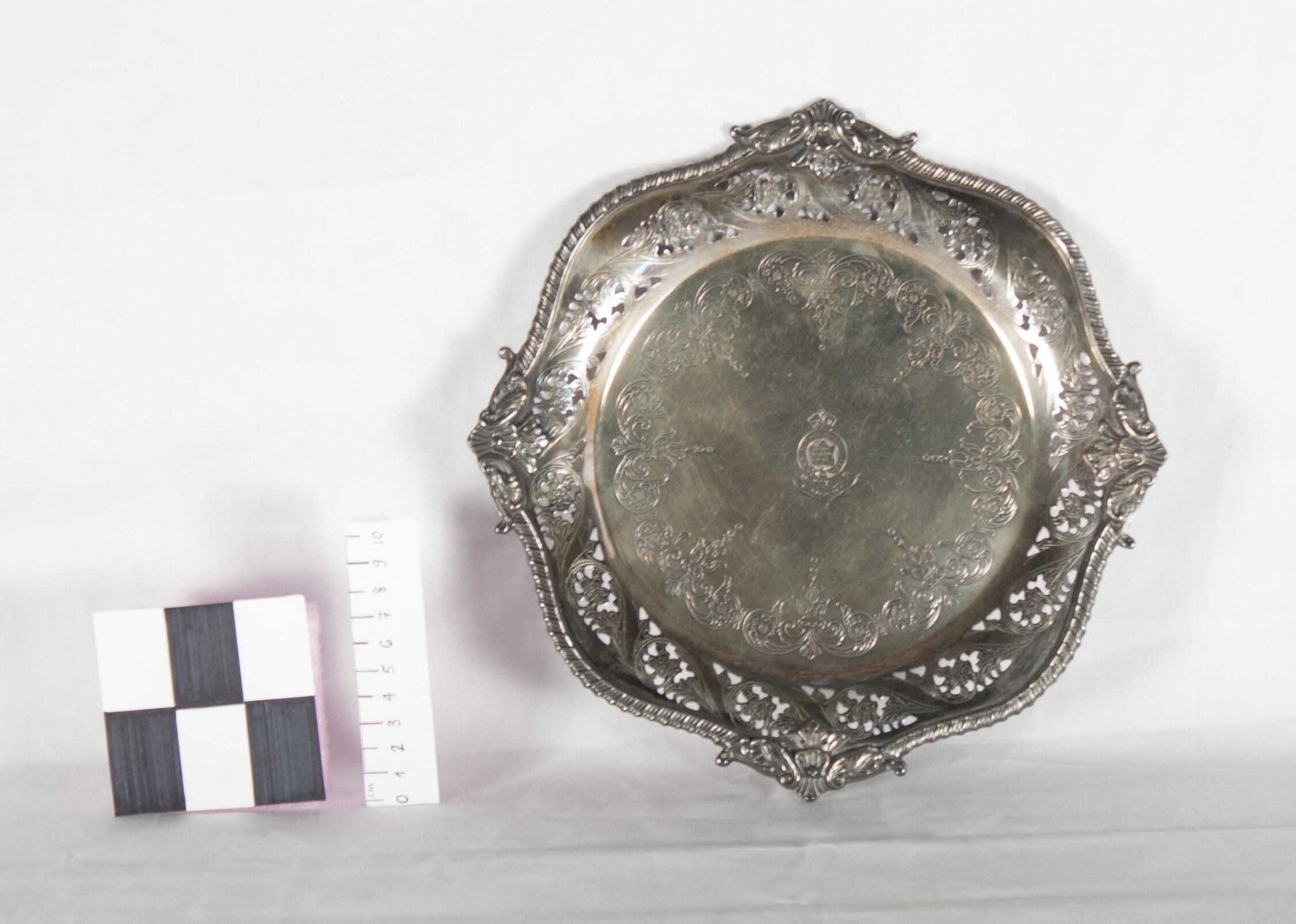 Silver plated tray with the Royal Montreal Regiment crest in the middle, and pierced rims finished with 'gadroon' edging.Made/Created