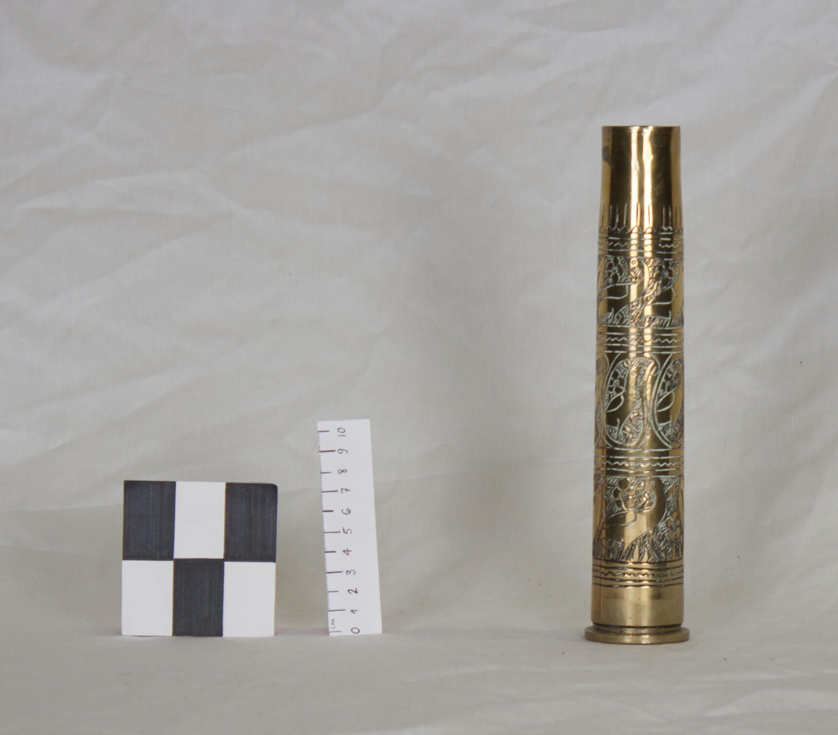 Brass empty shell casing with artistic inscription. We can see flowers, birds and leaves.