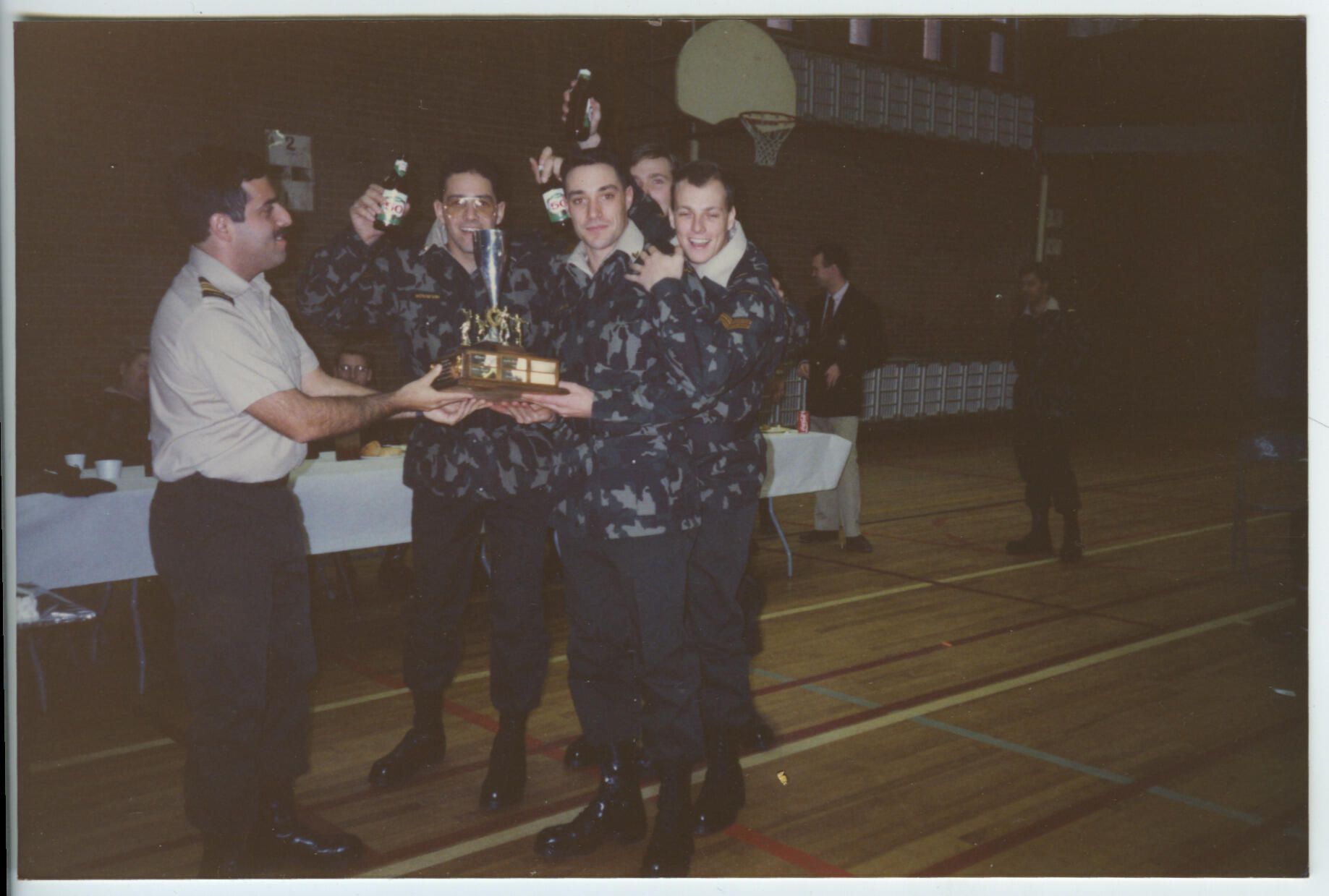 Lieutenant Colonel Toby Glickman is presenting a trophy to Private Yannick Di Cesare during the Christmas Dinner. Behind him, his companions are celebrating.Photograph Details