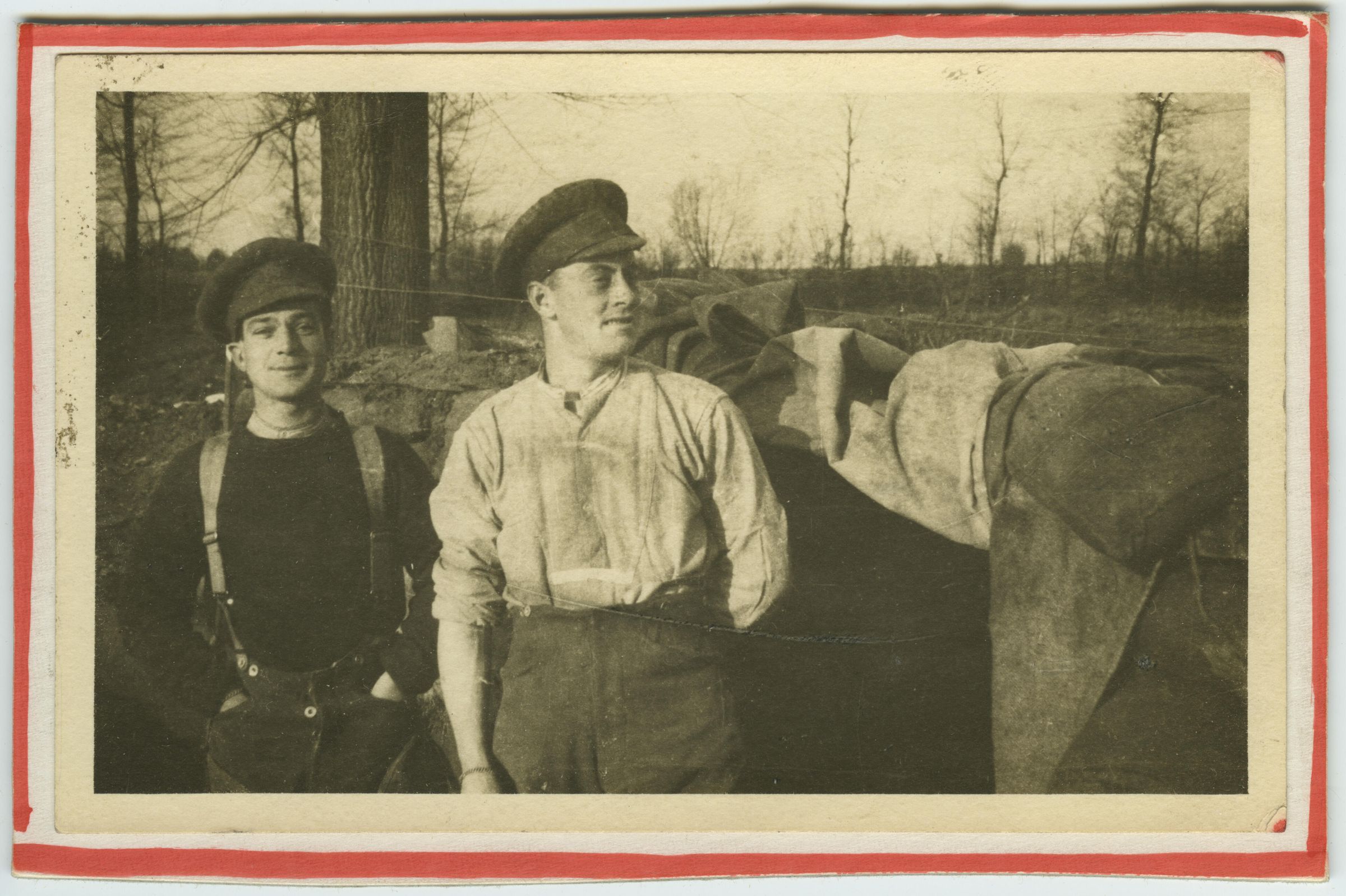 Two soldiers without their tunics on are standing next to a fence over which they have draped blankets. Behind them are leafless trees.Made/Created