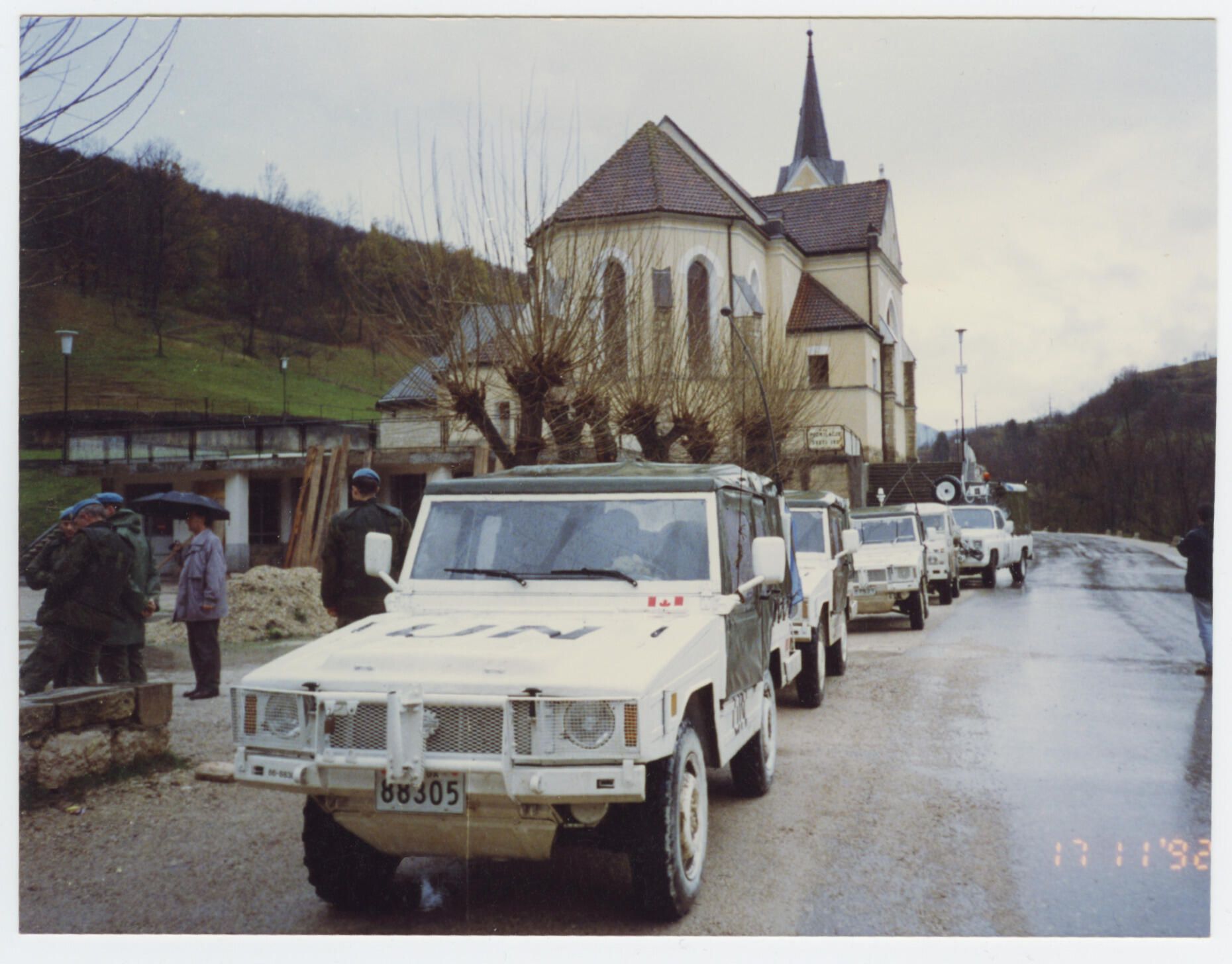 White UN vehicles passing through the streets of a village. Behind them is a church. On the left peacekeeping personnel are visible.Photograph Details