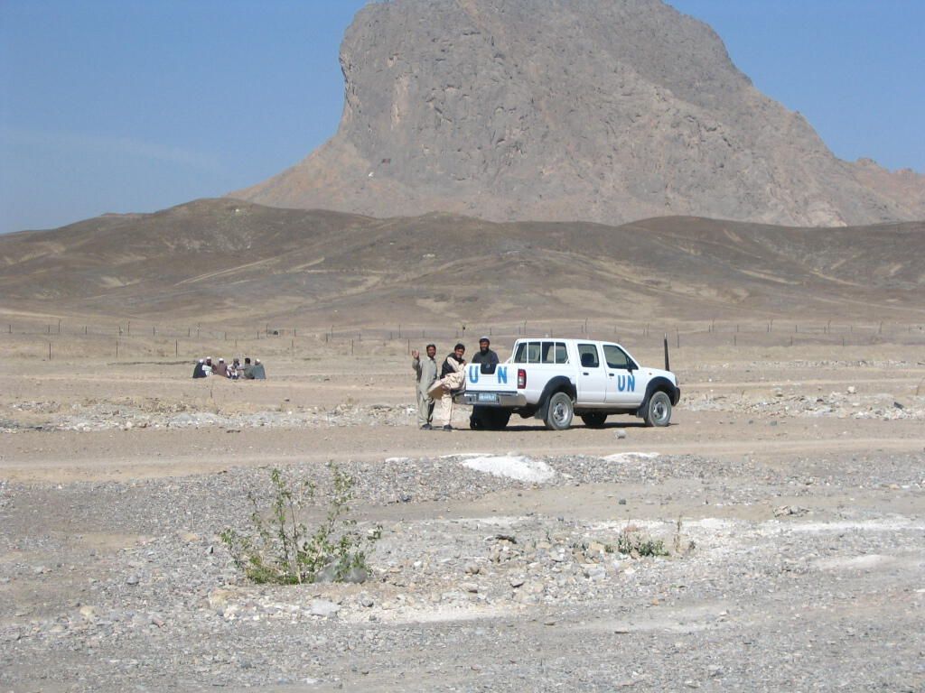 A white-painted commercial Toyota pickup truck bearing the letters "UN" painted on its side in blue. The vehicle belonging to the United Nations is stopped on the side of a road. Three Afghan civilians are standing at its side, while a group of six or more Afghan Civilians are seated in the distance.Photograph Details