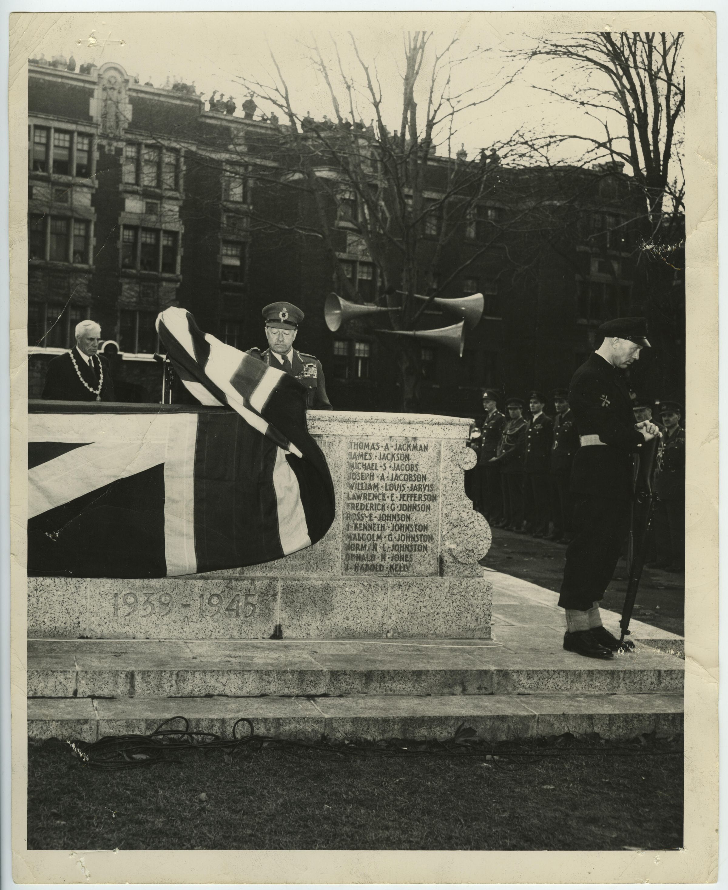Field Marshal Viscount Harold R.L.G. Alexander of Tunis, as Governor-General of Canada, is unveiling one of two additions to the Westmount Cenotaph, commemorating those who died in WWII. In the background, His Honour R. P. Adams, Mayor of Westmount, is wearing his Chain of Office. Many spectators can be seen lining the rooftop of the apartment building overlooking the Cenotaph.Photograph Details
