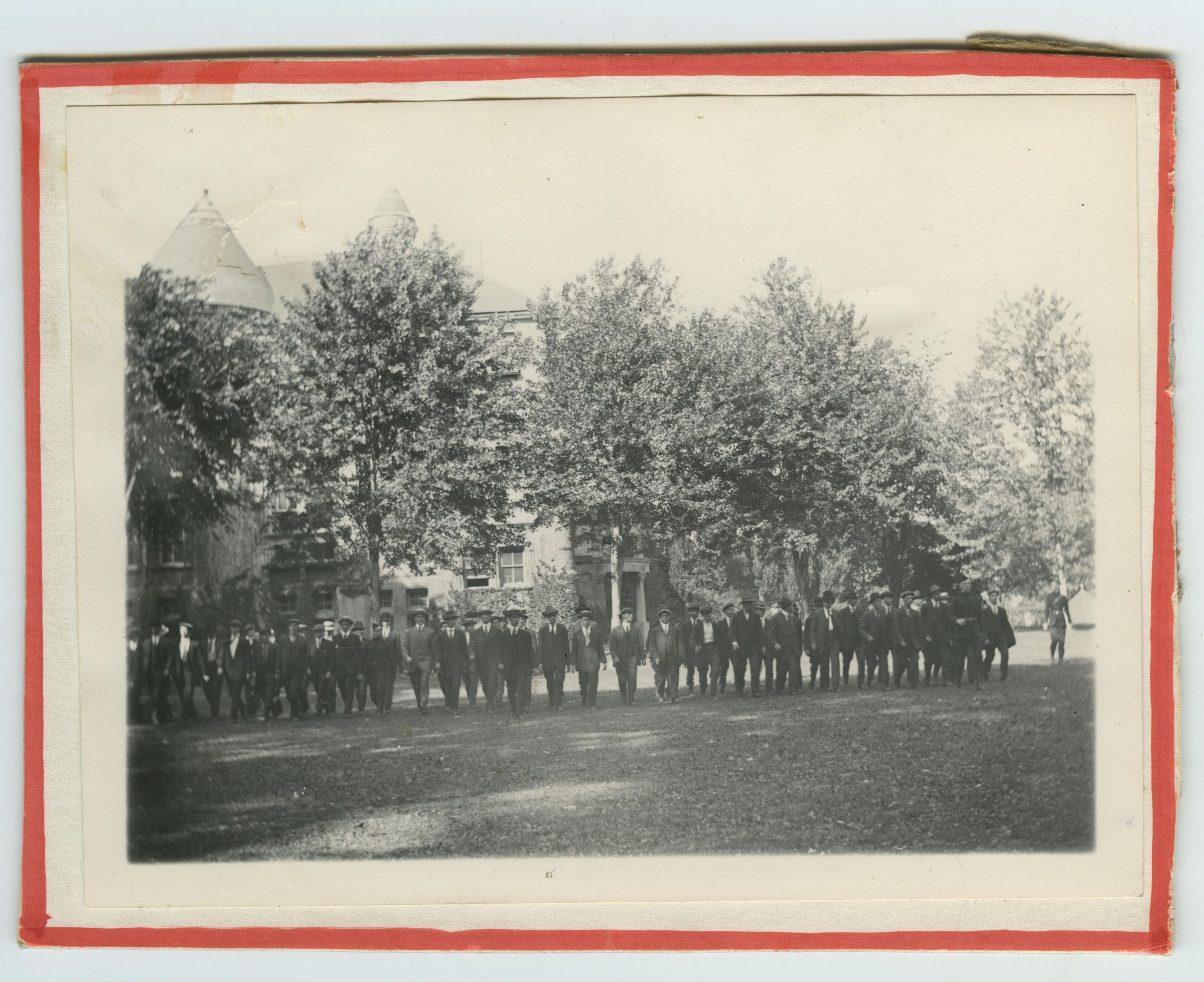 Recruits of the Victoria Rifles Coy of 14th Bn. Royal Montreal Regiment in civilian clothes walking in a line while drilling on the lower campus of McGill University.Photograph Details