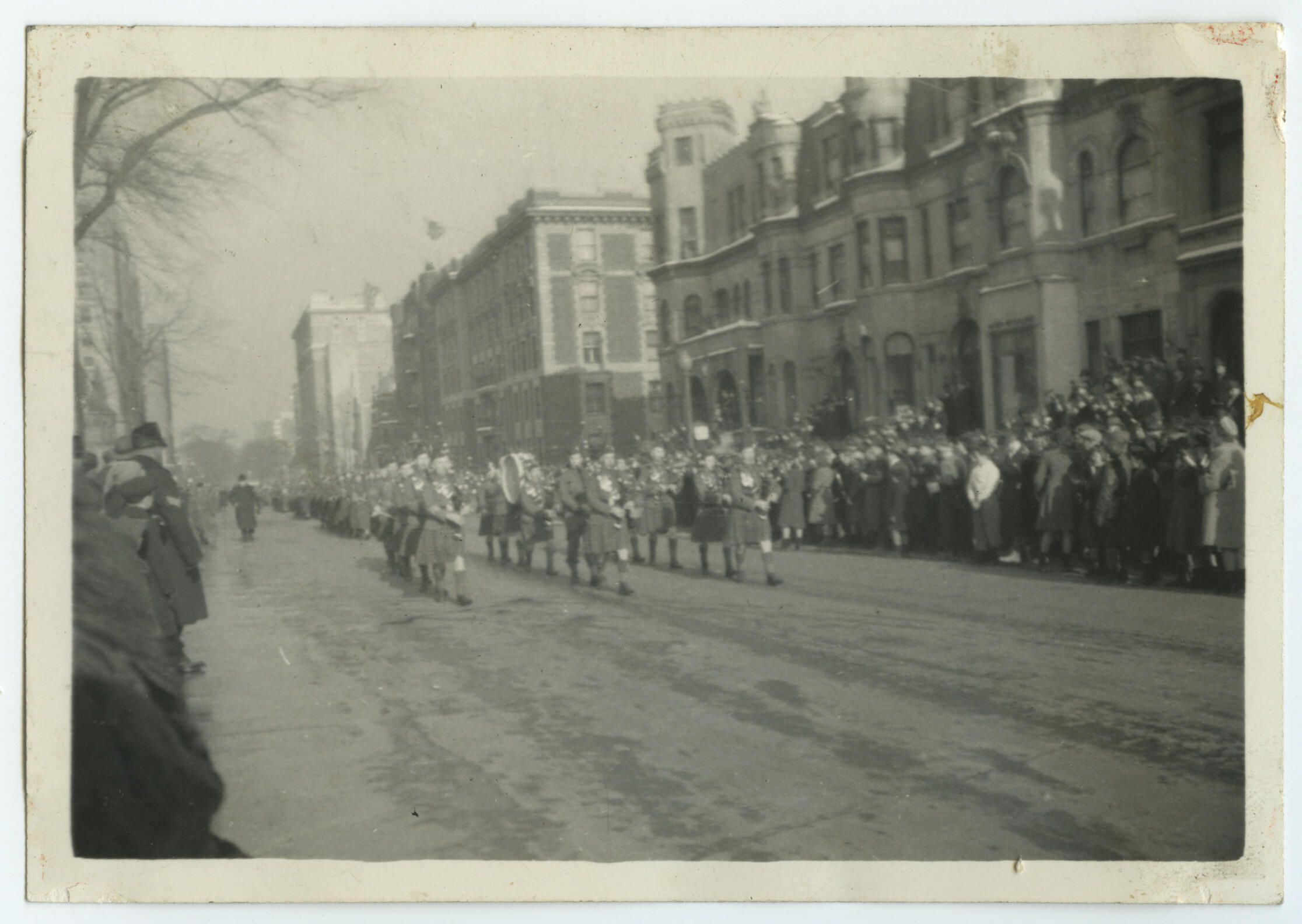 A black and white photo of a Highland Pipe Band marching west on Sherbrooke Street, Montreal, at the foot of Redpath Street.