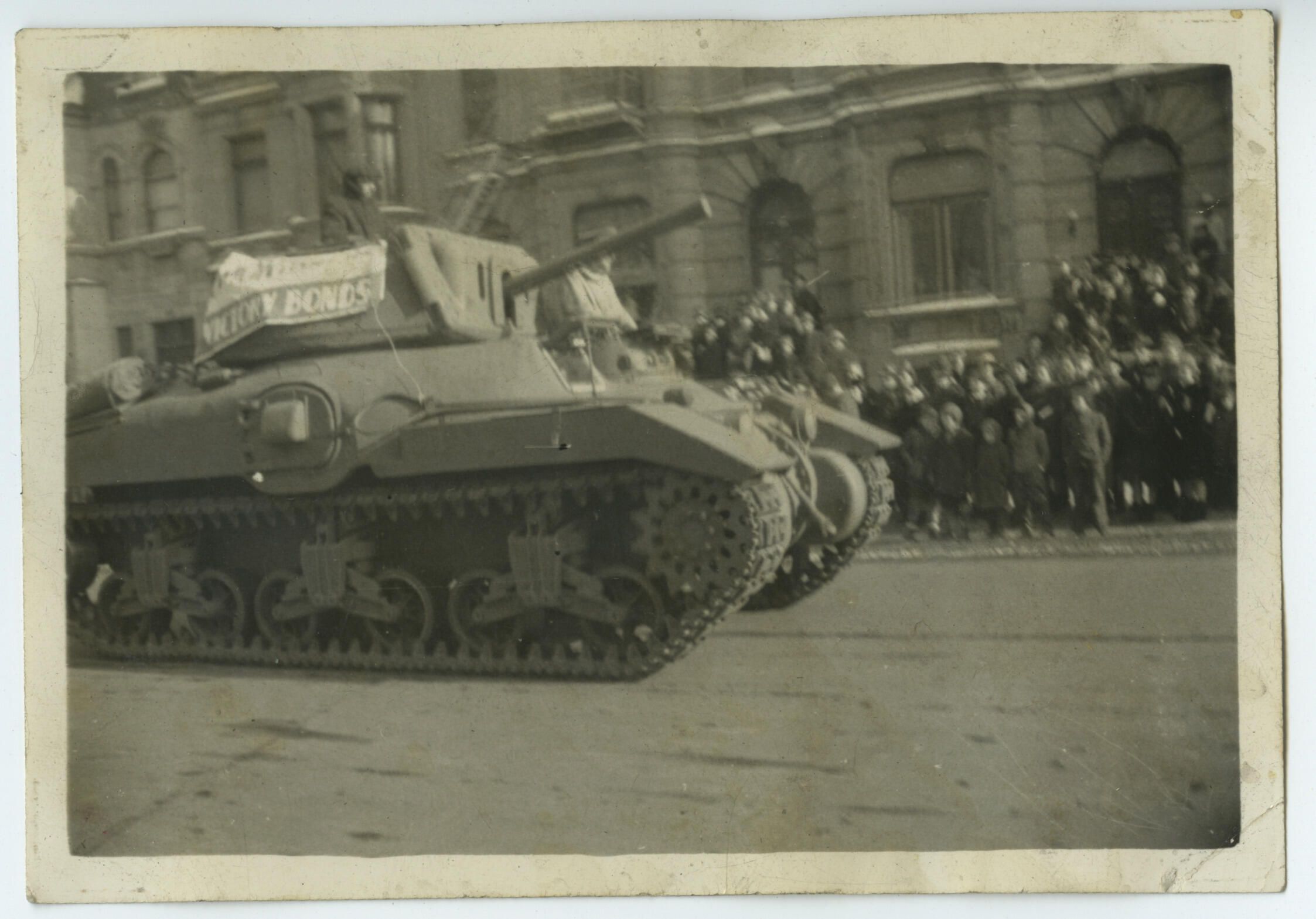 A black and white photo of a RAM Cruiser Tank built by the Montreal Locomotive Work In this photo it is taking part in a military parade on Sherbrooke Street, Montreal, to promote the Victory War Bonds campaign. As built, the Ram was never used in combat as a tank but was used for crew training in Great Britain up to mid-1944. When greatly modified for use as either an Observation Post, Armoured Personnel Carrier, Gun Tractor, Wasp II Flamethrower, or Munitions Carrier it saw considerable service in Europe.
