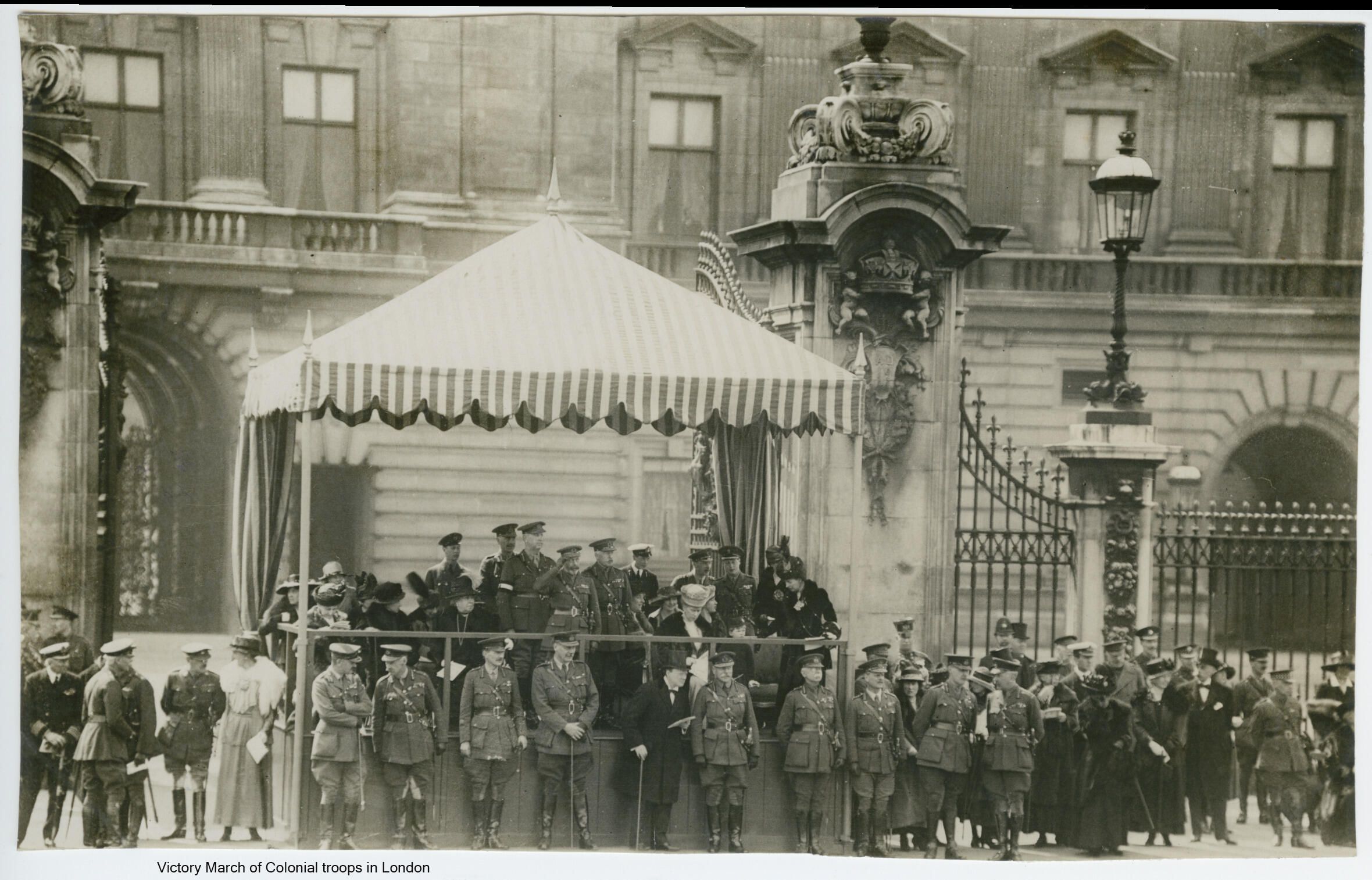 A scene from the Victory March of Dominion troops in London, England. King George V is taking the salute with Queen Mary and members of the Royal family on a raised dais under a striped awning. Standing in front is a line of Generals with Winston Churchill standing in the middle. General Arthur Currie is standing over the King's right shoulder.Photograph Details