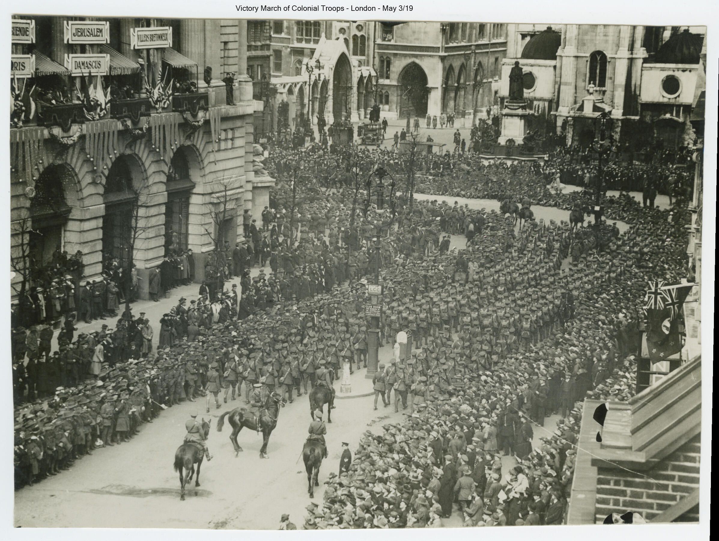 Held on May 3,1919, the Victory Parade of over 11,000 Dominion and Colonial troops (Canada, Australia, New Zeland, South Africa) marched through London. They were reviewed by King George V and guests in front of Buckingham Palace.