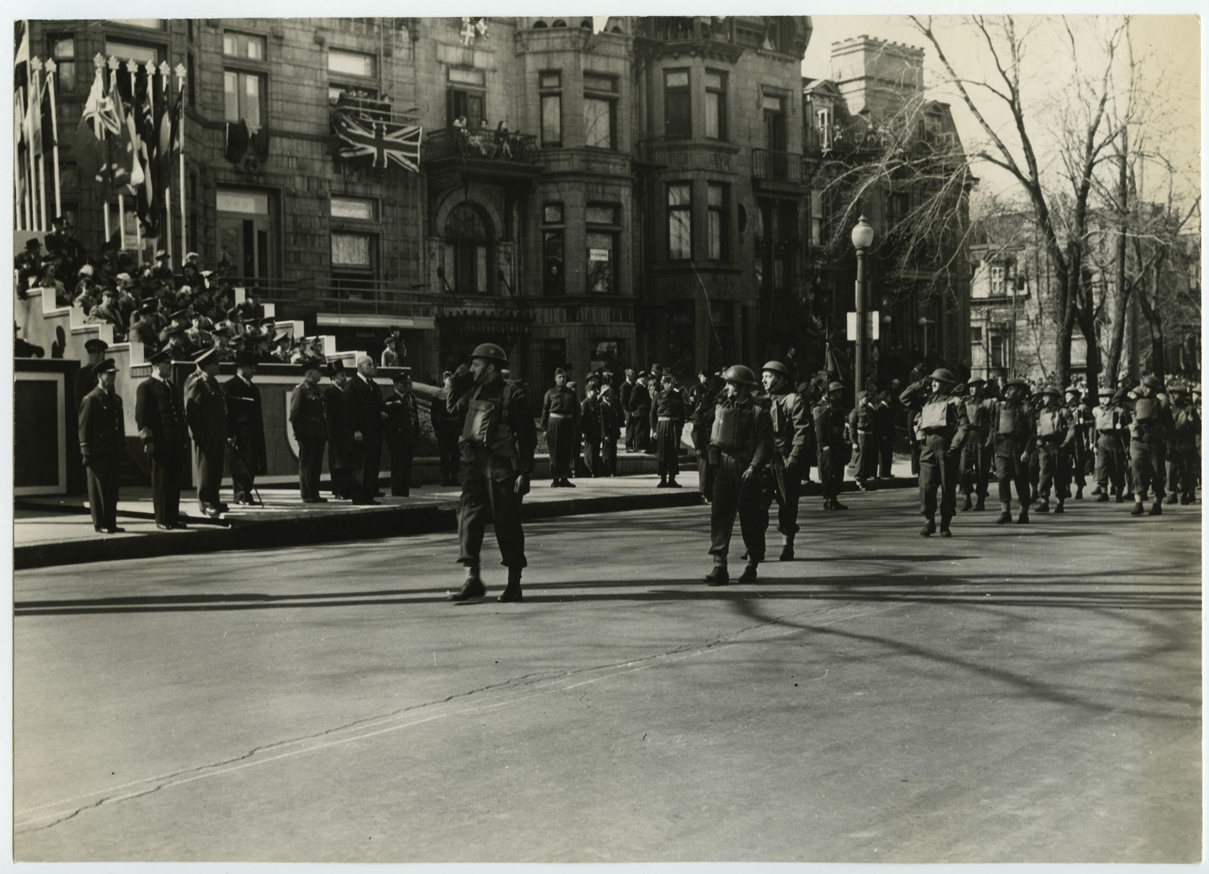 Members of the 2nd Battalion, The Royal Montreal Regiment, marching on Sherbrooke Street, Montreal, taking part in the sixth Victory Loan Campaign. This campaign was launched on April 24, 1944, by Prime Minister MacKenzie King and was to finish on May 13, 1944.