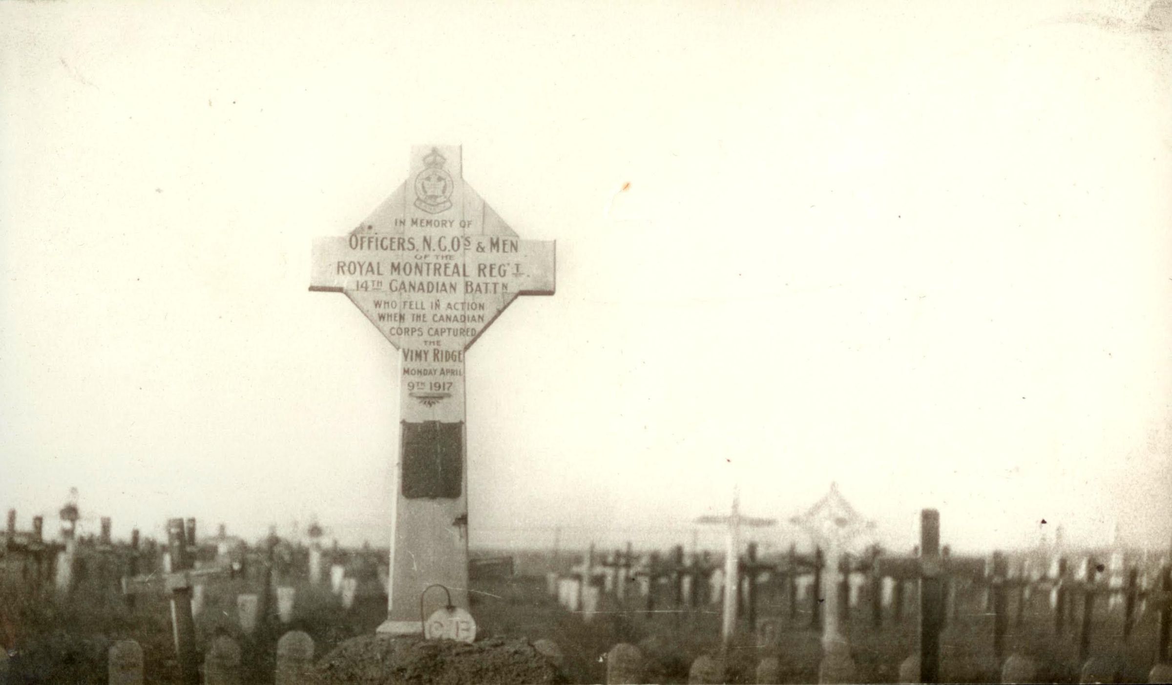 "IN MEMORY OF - OFFICERS, N.C.Os & MEN - OF THE - ROYAL MONTREAL REG'T - 14th CANADIAN BATT'N - WHO FELL IN ACTION - WHEN THE CANADIANS CAPTURED - THE - VIMY RIDGE - MONDAY APRIL - 9 1917."