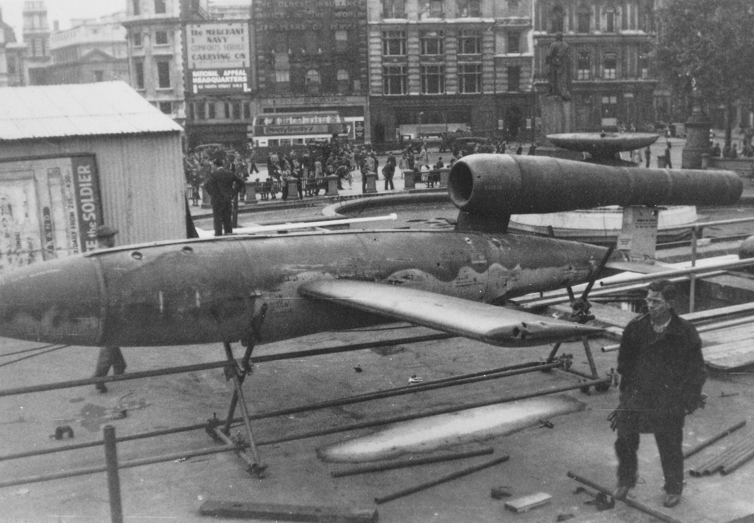 A black and white photo of a war prize, aGerman V1Rocket, in Trafalgar Square, London, England. A fountain is visible in the background. This rocket was also known as a "Flying bomb", a "Buzz bomb", and a "Doodlebug".
