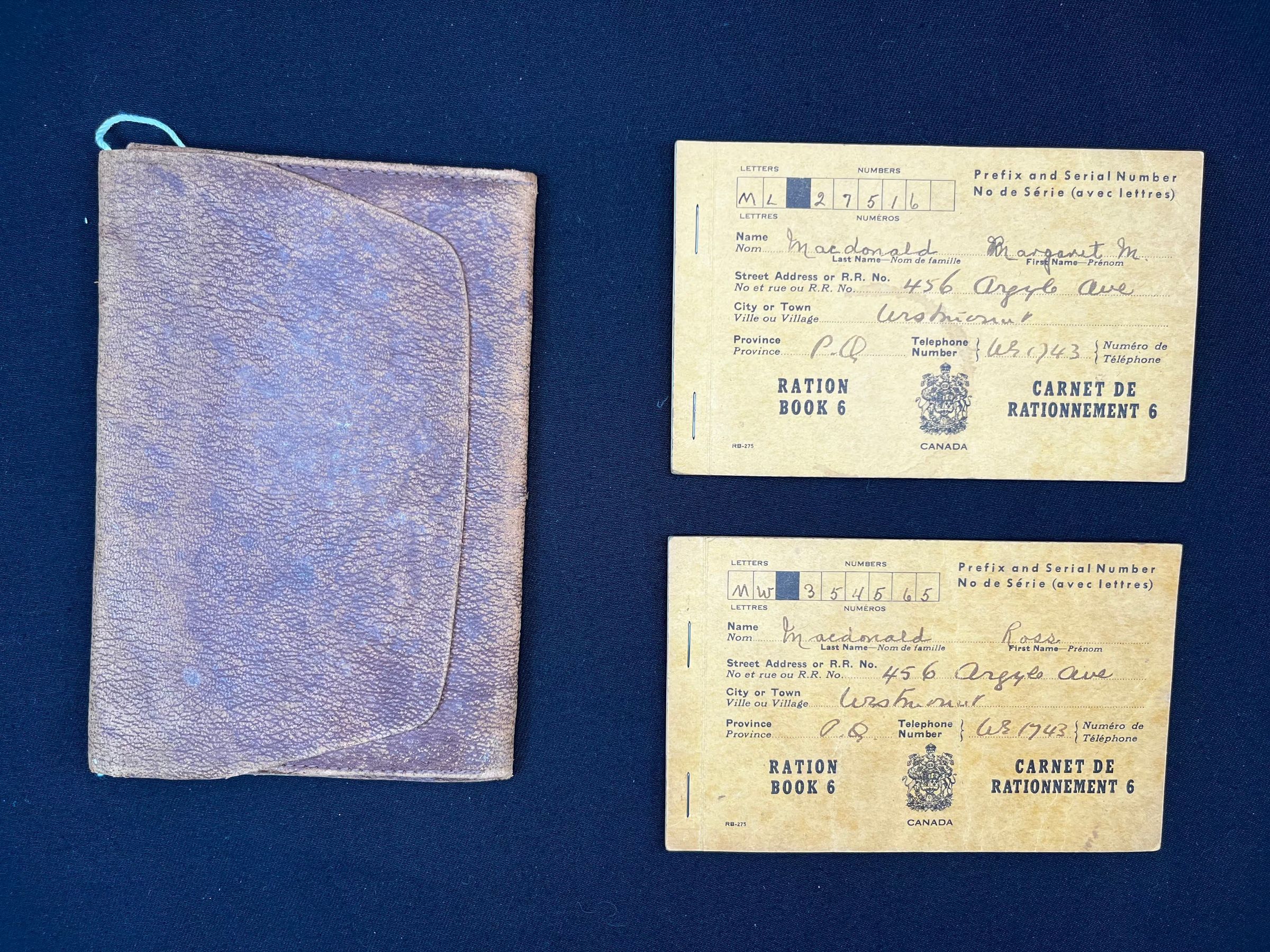 Two civilian war ration booklets in a leather pouch. One booklet (2025x.03.04a) belonged to Margaret M. Macdonald of Westmount and the second (2025x.03.04b) belonged to Ross Macdonald. Both booklets are in a worn brown leather envelope-like pouch with "WAR RATION BOOKS" embossed in gold under the flap.