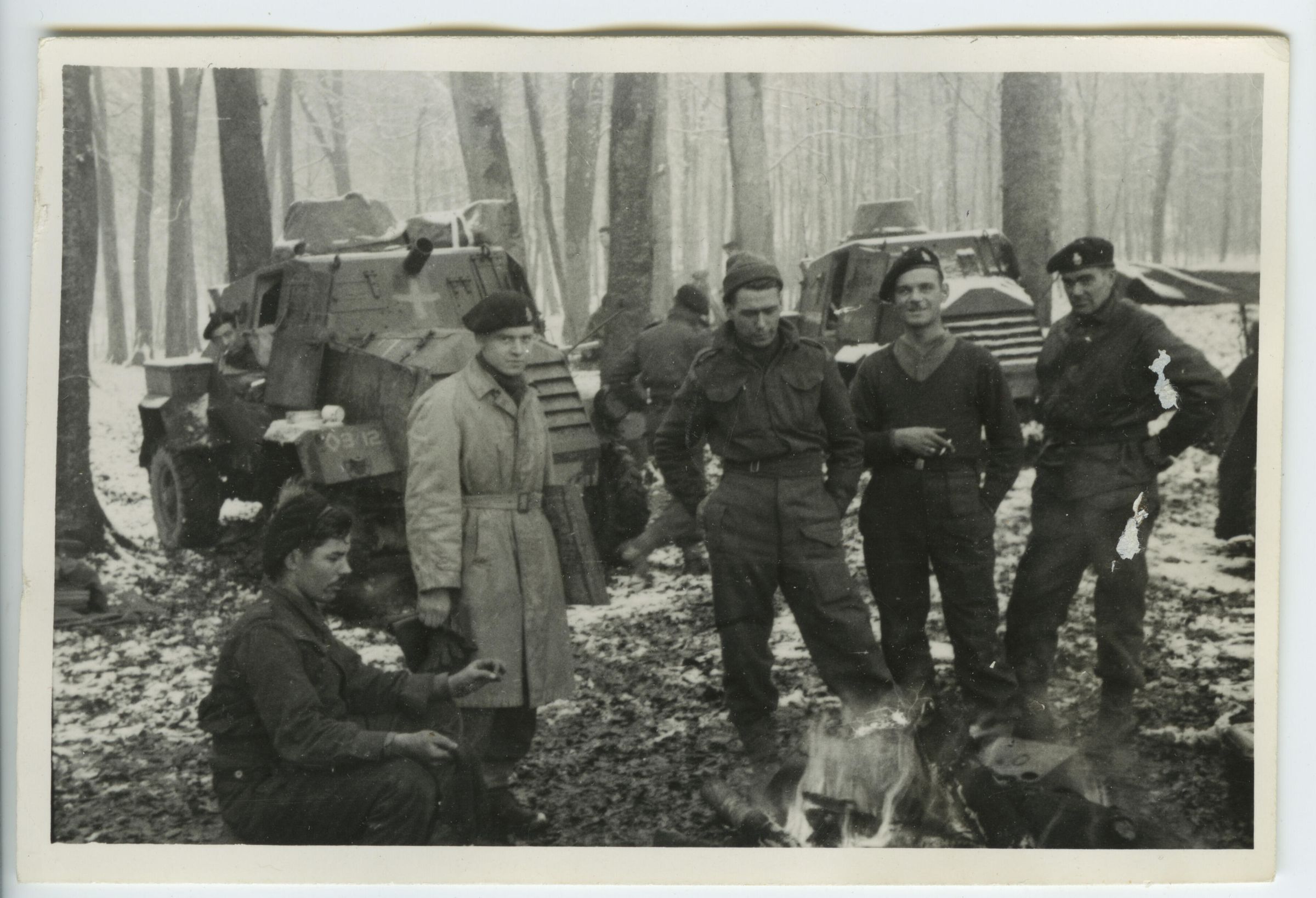 Five men in uniform are standing around a fire in a wintery forest. Some of them are holding cigarettes. Behind them, armored vehicle are visible.Made/Created