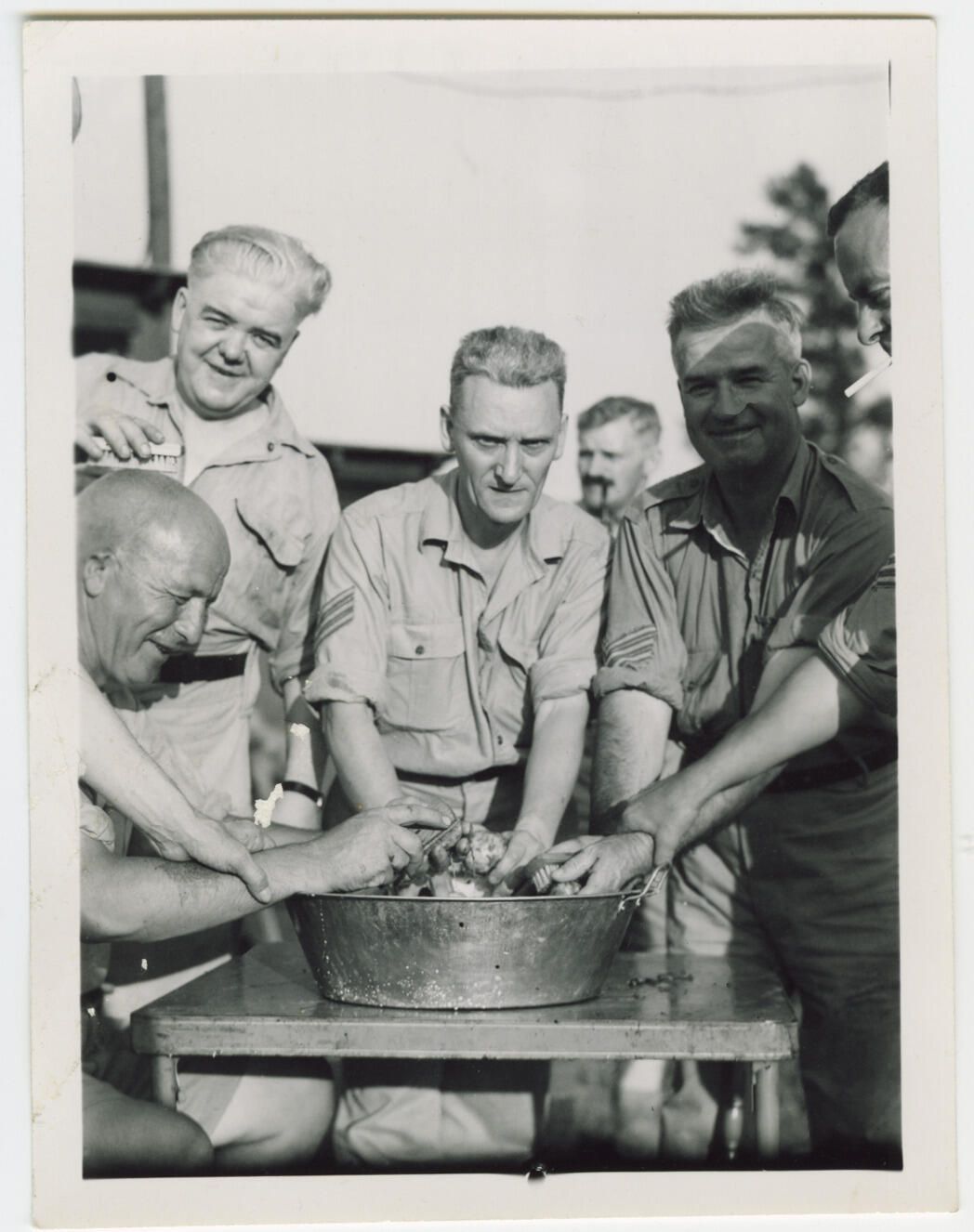 A black and white photo of some Senior NCOs washing what appears to be potatoes. On the left, Sergeant Wally Loudon, a World War I veteran, is getting his head scrubbed.Photograph Details