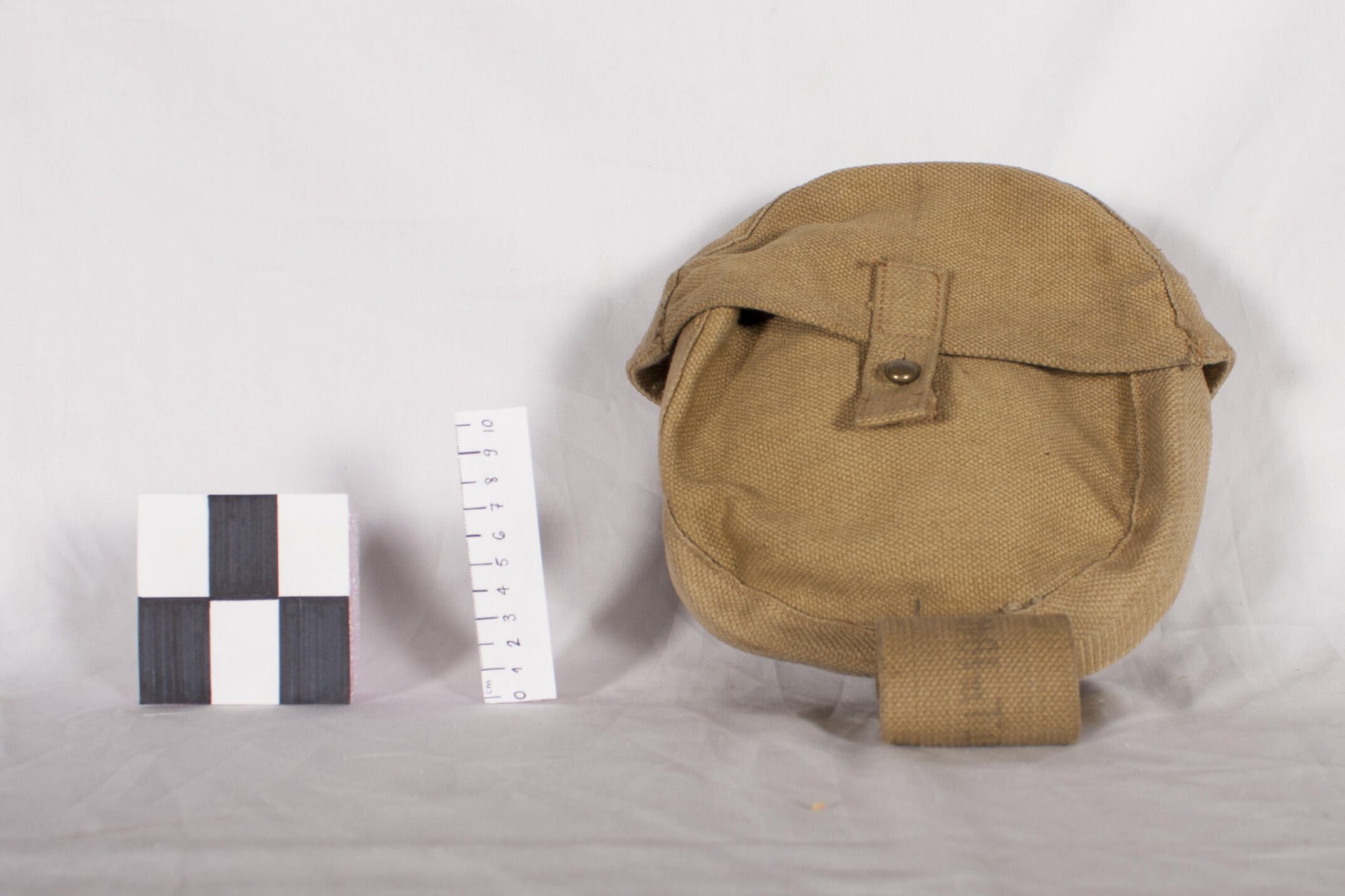 British khaki canvas mess tin cover. See 2002.61.01 for the set of tins carried in this cover.Made/Created