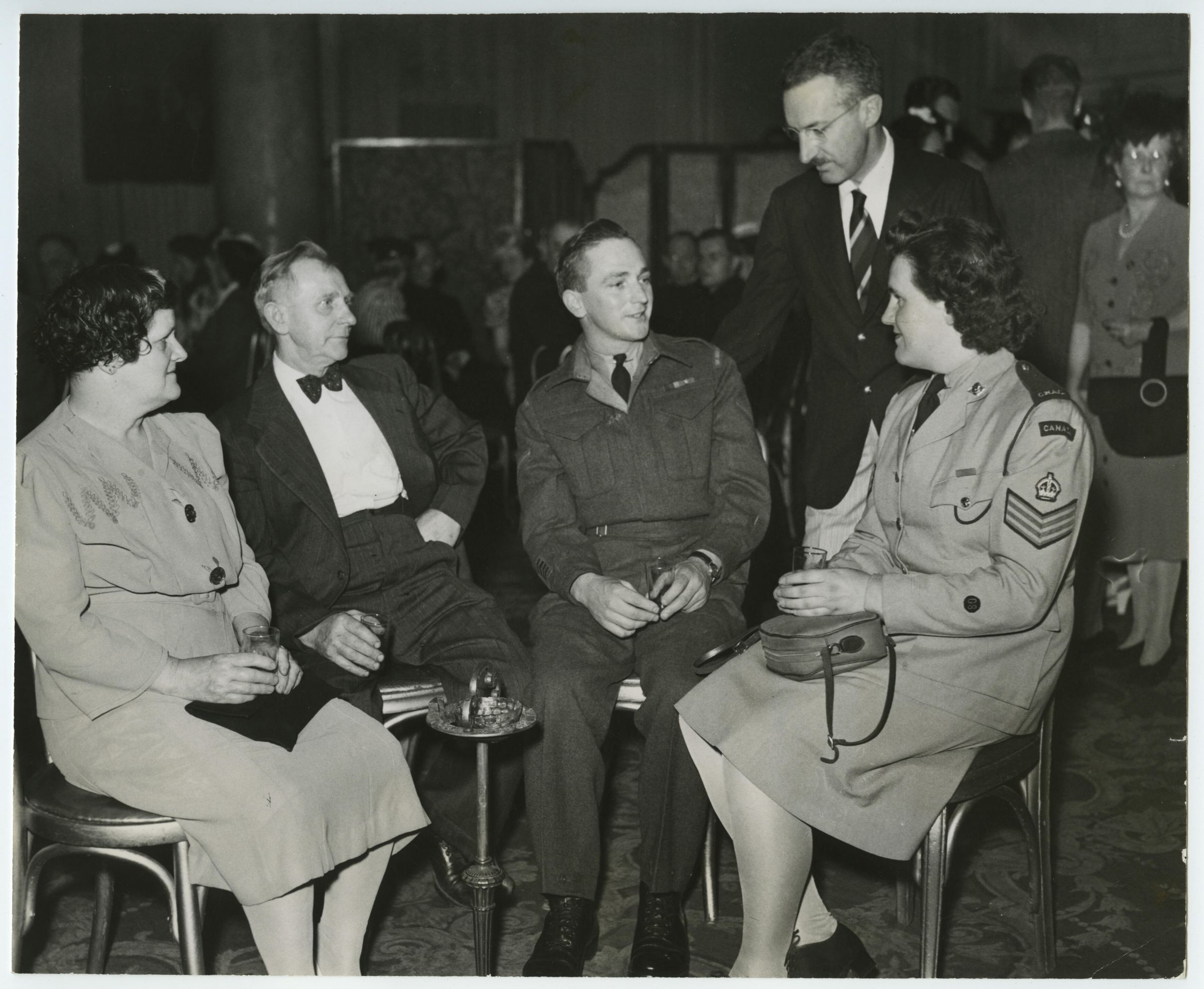 A black and white photo taken at the Windsor Hotel during the Welcome Home Party thrown by the Canadian Prisoner of War Relatives Association. Lieutenant Colonel Brewer, Commanding Officer of the 2nd Battalion RMR, has a talk with Lance Corporal Westlake and his parents. Staff Sergeant Henderson of the Canadian Woman's Army Corp (CWAC) listens in.Photograph Details