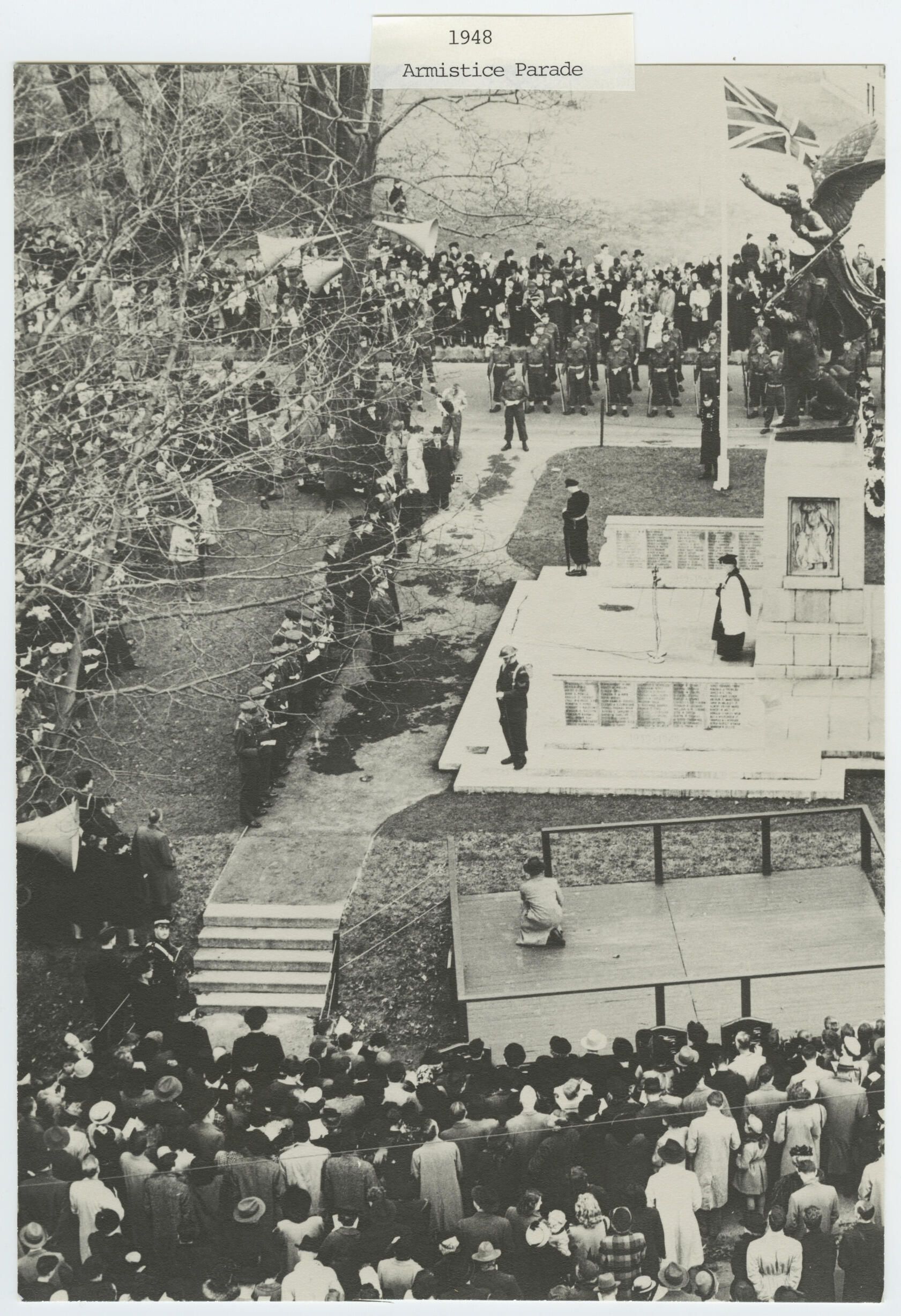 The occasion was the annual Remembrance Day parade and service at the City of Westmount Cenotaph November 7, 1948. The two memorial walls flanking the main monument bearing the names of the Fallen in World War II (1939-1945) which had been unveiled by the Governor-General Lord Alexander the previous year are clearly visible in this photograph.Relationships