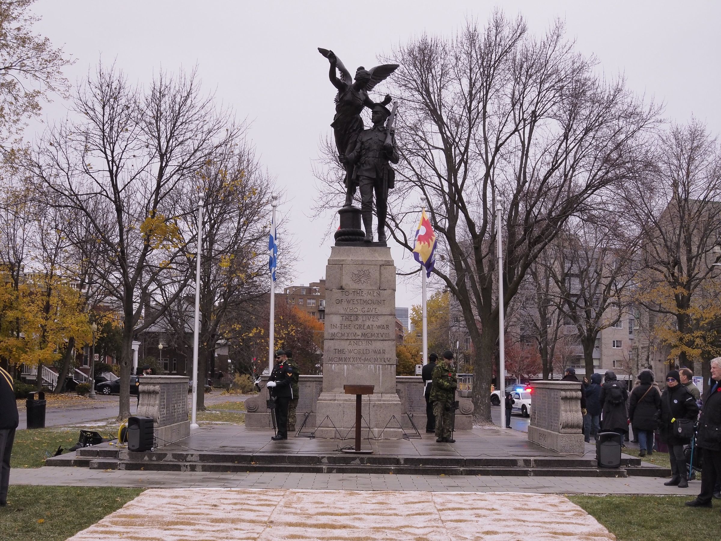 The Westmount Cenotaph in Vimy Park, Westmount, Quebec. Four RMR soldiers in DEUs and in combats stand guard at each corner of the cenotaph. There are civilians around the left side. The Westmount flag and the Quebec flag are visible on either side of the centoaph.