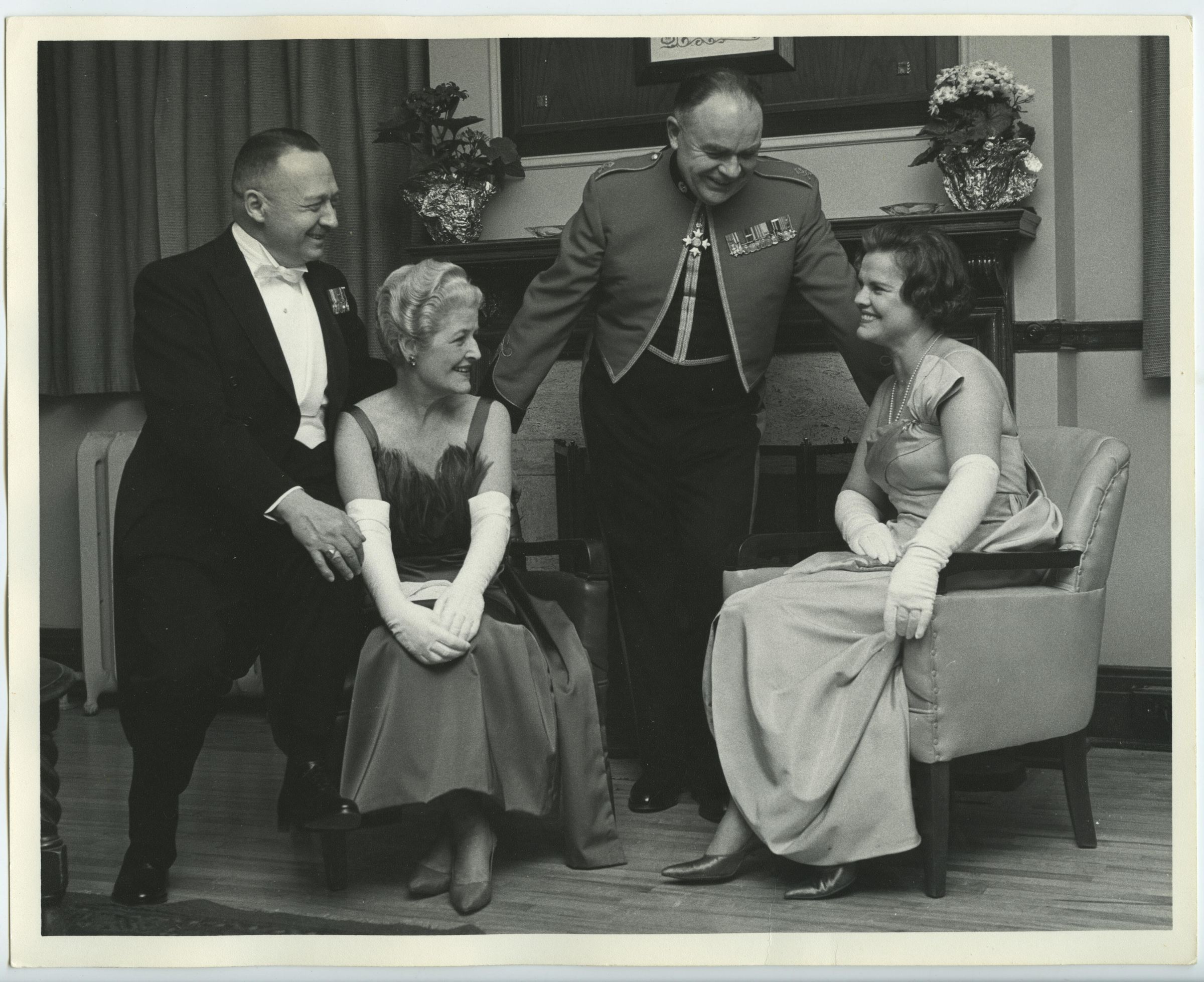 A black and white photo of Maj-Gen Frank J. Fleury and wife, in company with Major Paul Barré and wife. They are in the Officers' Mess ante-room and are attending an Annual Regimental Ball.Photograph Details