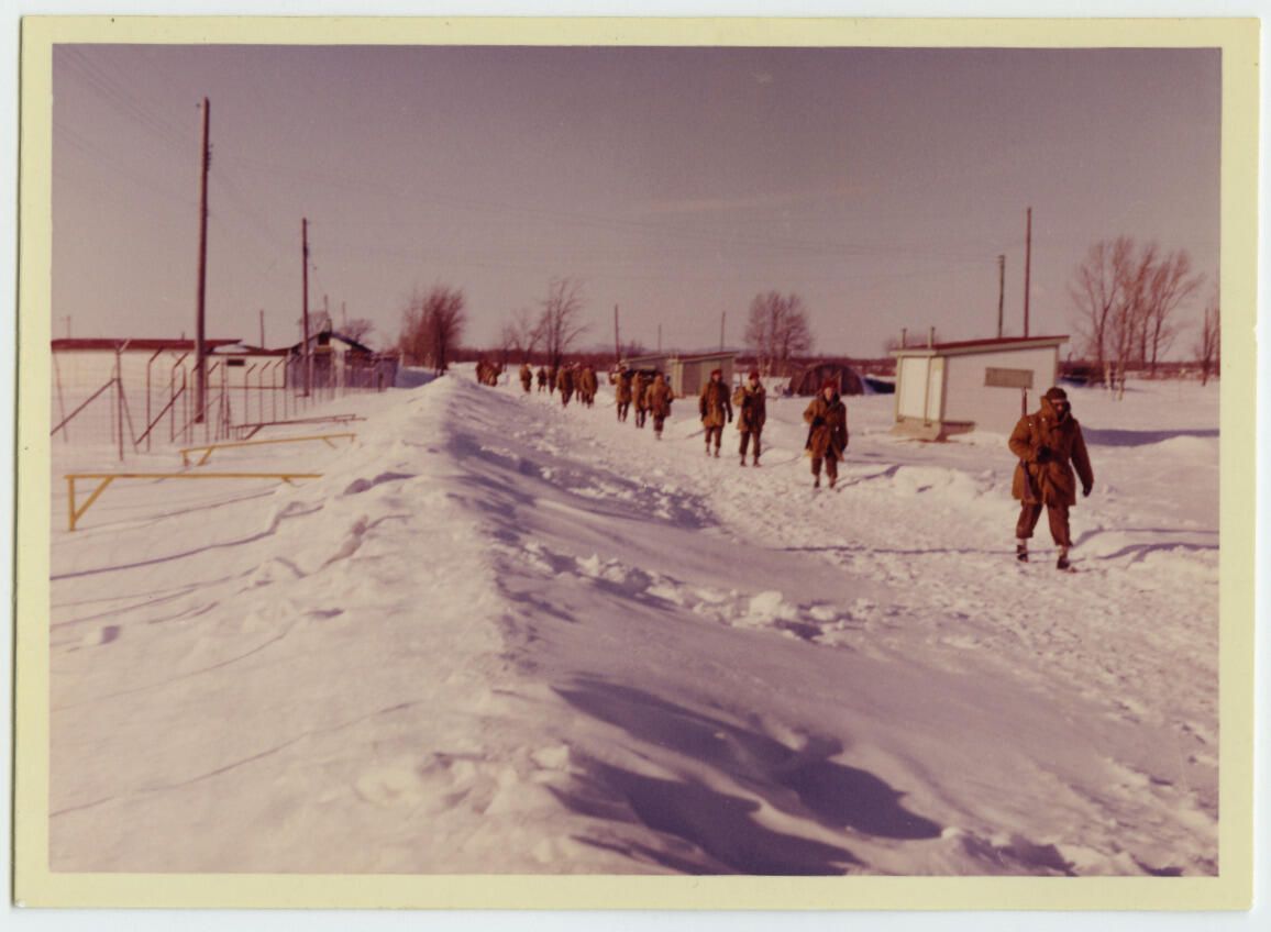 A group of Royal Montreal Regiment member moving in a line in the snow. They are taking part in a regimental Winter Exercise in Camp Farnham.Photograph Details
