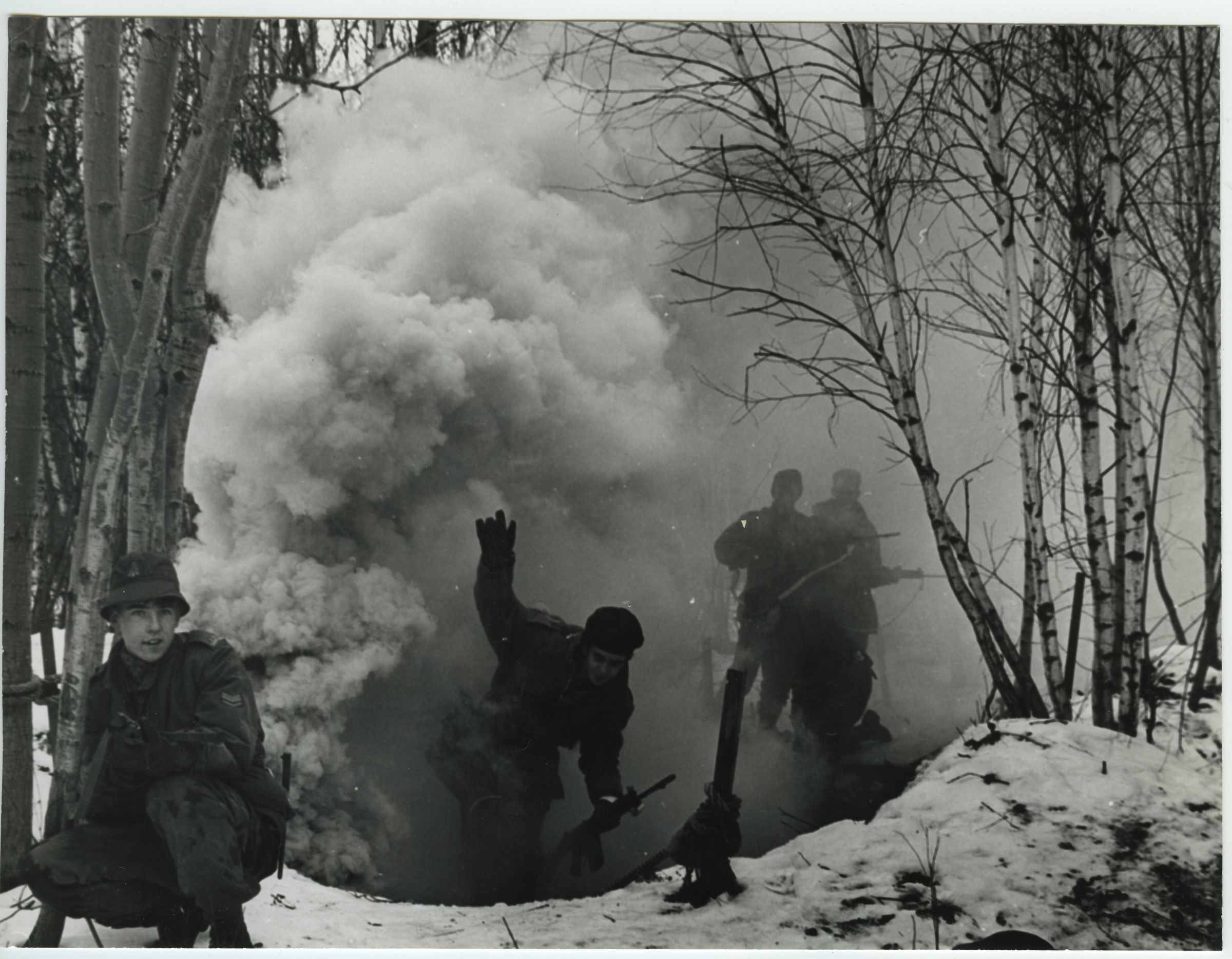 A scene from a Winter training exercise in Farnham Camp. Several soldiers holding their weapons are moving towards the camera through thick smoke.Photograph Details