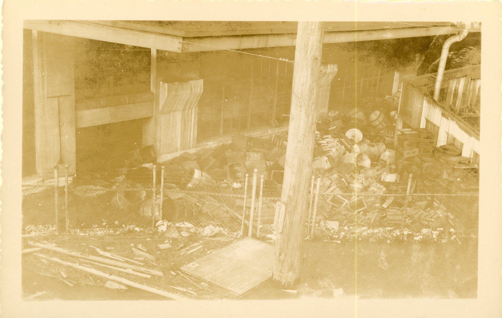 Black and white print photograph of Saco River flood damage in Saco, Maine depicting piles of wood and barrels. From the Sawyer House Collection.Dimensions