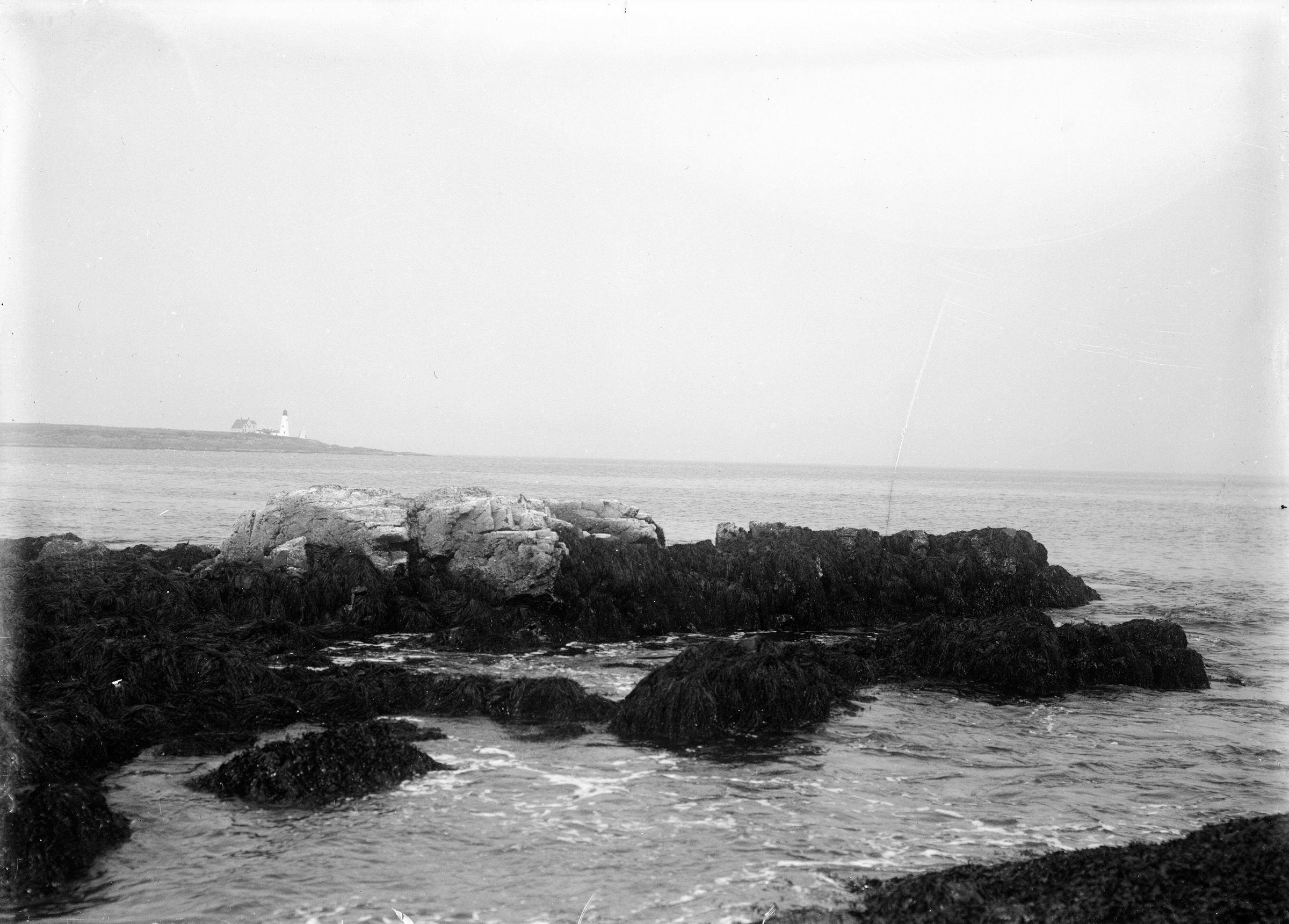 Glass plate negative photo of Biddeford Pool with Wood Island Lighthouse in the background.