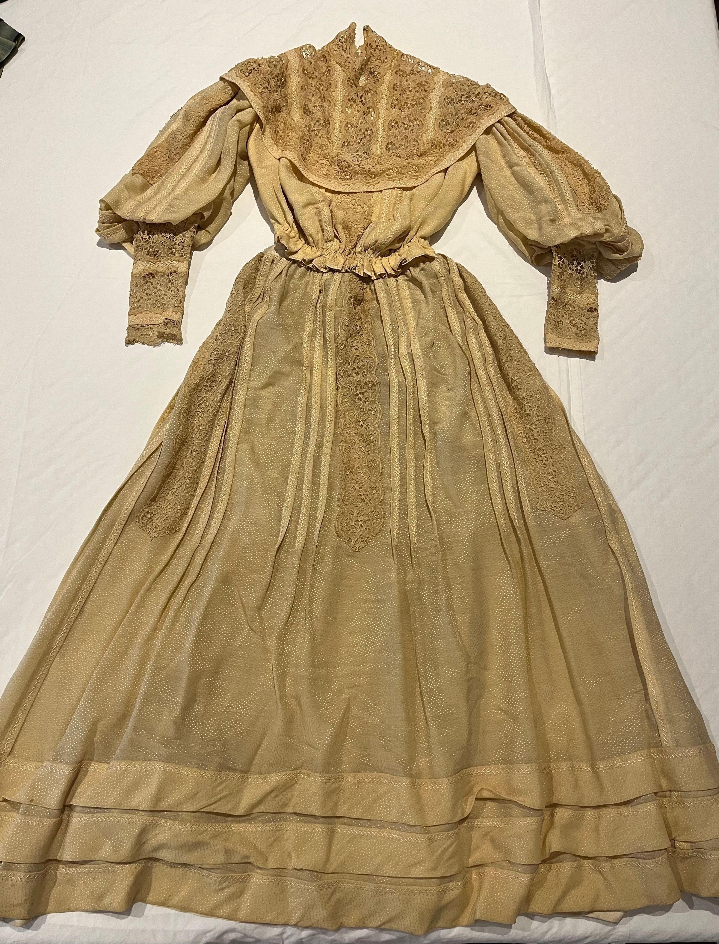 Pale yellow two-piece dress with lace trim. The dress fabric is similar to, if not, dotted Swiss fabric. High lace collar and yoke. The leg of mutton sleeves, pleated with lace panels, the fabric embroidered with silk in a feather stitch. The lower part of the sleeve are panels of lace with bands bands of the embroidered dress fabric; the lace is missing from the bottom of the left sleeve. Full skirt with vertical panels of lace on the front; no lace on the back. They alternate with three pleats of feather stitch embroidery. Above the hem there are three rows of applied fabric with feather stitch embroidery. Silk ribbon sewn in above the inside of the hem. The skirt waistband is made of the same silk ribbon.