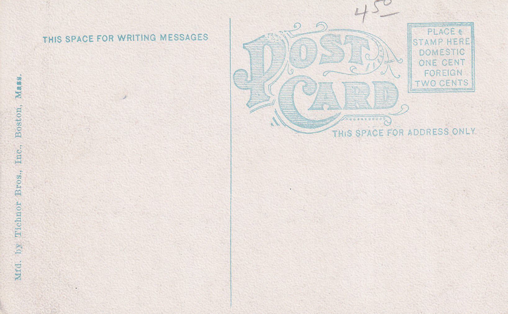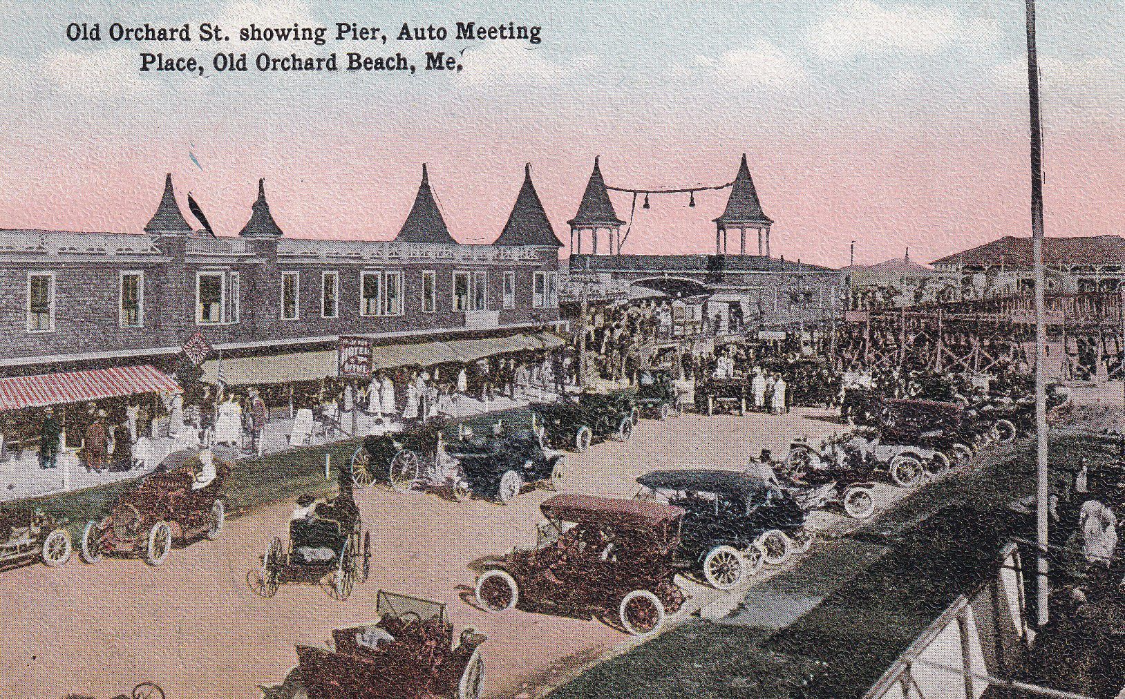 A postcard bearing a colorized image of a parking area for cars with businesses and the pier in the background.