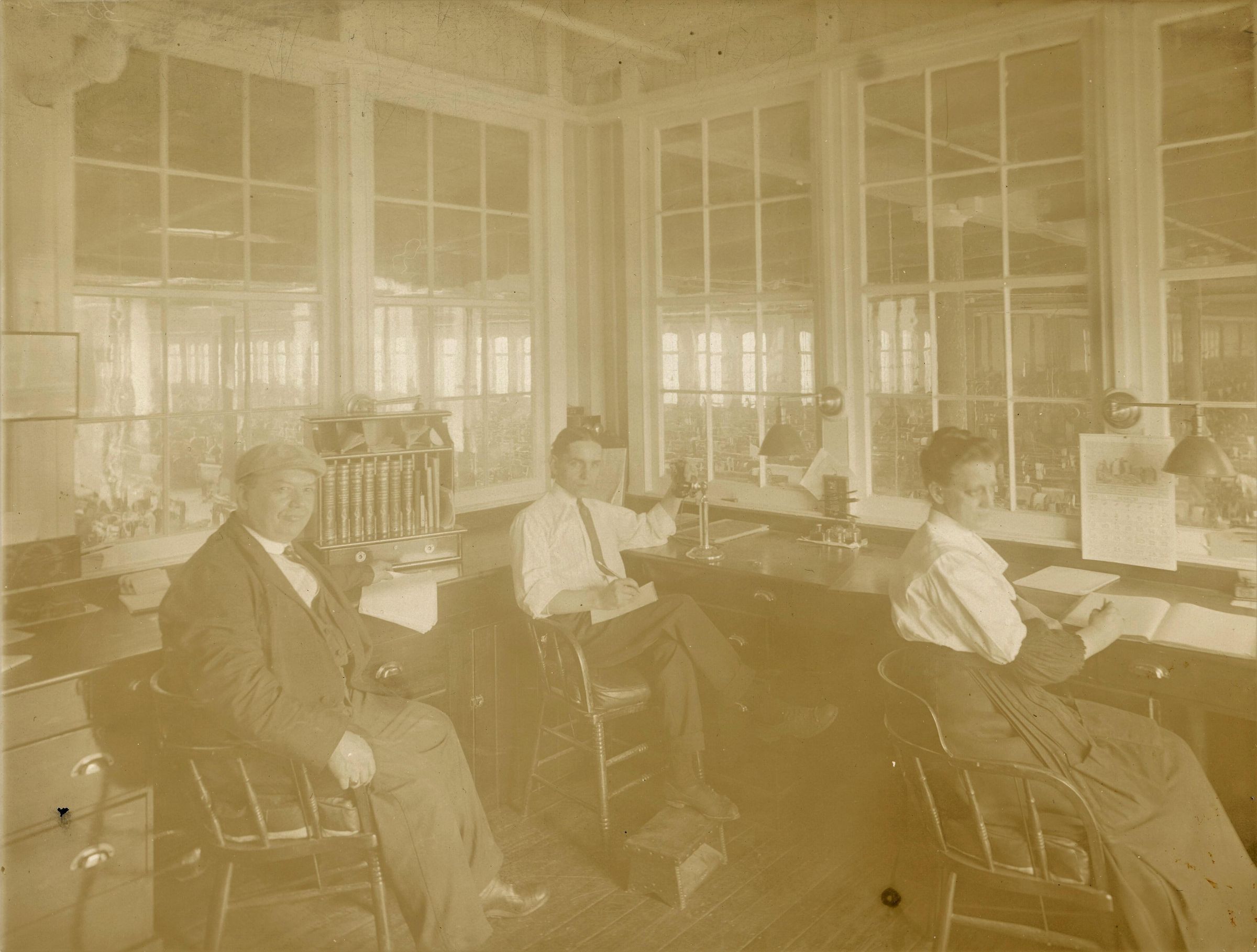 Photograph of two men and a woman sitting in an office in the Laconia Division of the Pepperell Manufacturing Company. They are overlooking one of the weaving rooms. (See 2022.59.4 for a view of the office from the floor of the weaving room).