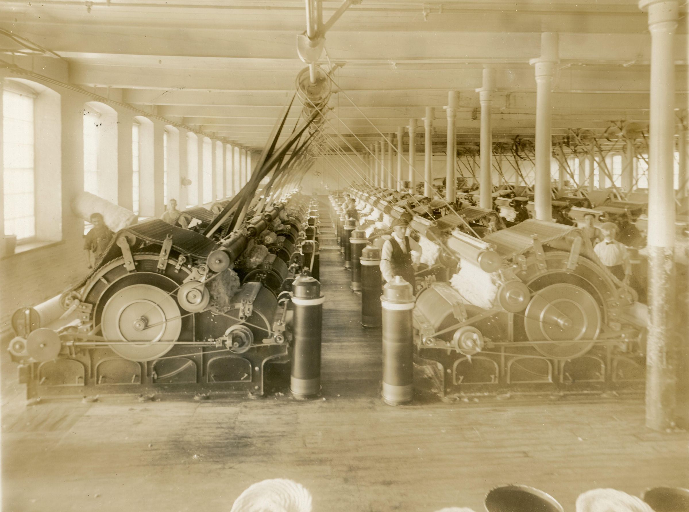 Photograph of workers in a carding room in the Laconia Division of the Pepperell Manufacturing Company.
